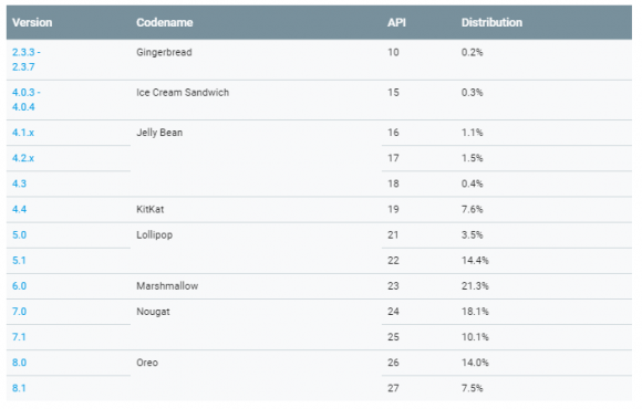 În rest avem o distribuţie apropiată cu cea a lunii septembrie, cu creşteri logice pentru Android 8.0 / 8.1 Oreo şi scăderi la fel de normale pentru versiunile mai vechi. Android 7.0 / 7.1 Nougat rămâne în continuare lider cu o cotă de 28.2%, urmată de Android 8.0 / 8.1 Oreo cu 21.5% şi Android 6.0 Marshmallow cu 21.3%.