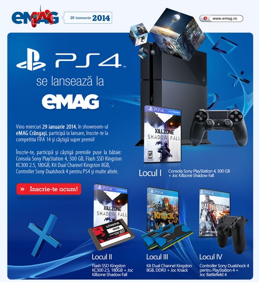 PlayStation 4 este prezent la vânzare în multe magazine online şi offline din România, lansarea oficială a acestui nou produs se va realiza abia miercuri, 29.01.2014, într-un show marca eMag.ro.