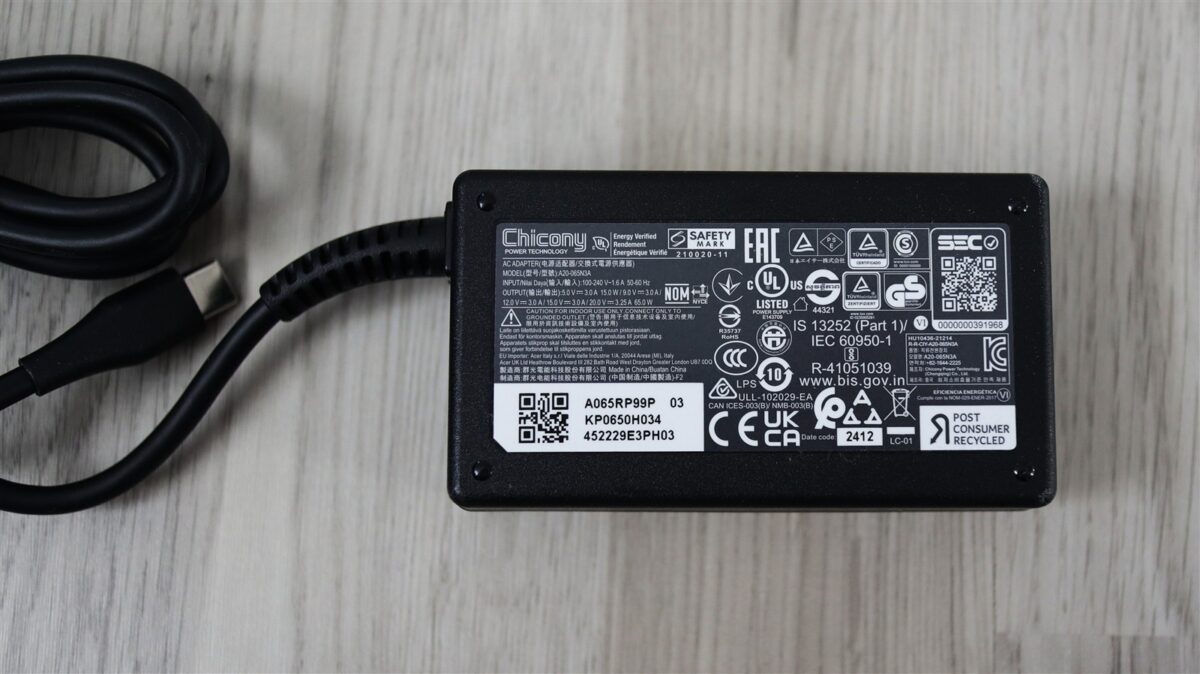 În fine, laptopul ajuns la mine în cutia de retail avea lângă adaptorul de alimentare / încărcare, cu mufă USB-C și putere maximă de 65W, și cablul de priză pentru acesta. Variantele din comerț vor primi cu siguranță și ceva pliante.