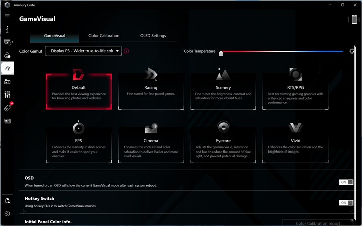 Sunt foarte multe moduri predefinite de reglaj al ecranului în Armoury Crate. Fiecare dezvăluie nu doar alte nuanțe, cu alt balans de alb și al nivel al contrastului, ci și un sharpness mai accentuat în anumite scenarii. Mai mult, la fiecare mod poți alege dintre alte 4 tipuri de reprezentare a culorilor (Native, sRGB, DCI-P3 și Display P3) și mai poți regla dintr-un slider balansul de alb, către zona mai caldă, respectiv mai rece.