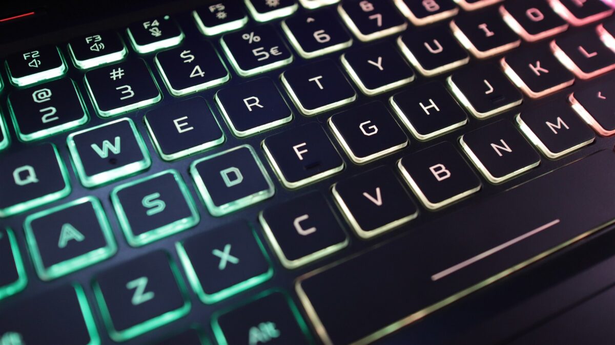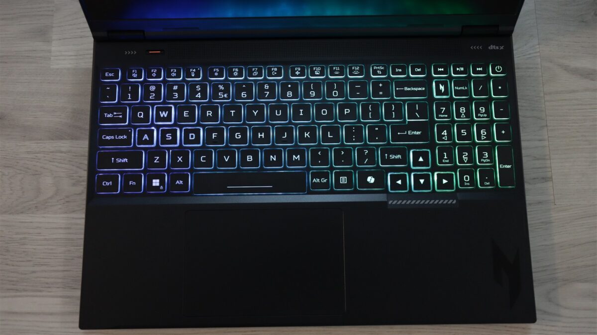 Tastatura este completă, se întinde pe mai toată lățimea laptopului, cu tastele NumPad ceva mai înguste. Butoanele sunt iluminate RGB pe patru zone distincte, iar feedback-ul la actuare este dintre cele corecte, bine dozate atât din punct de vedere al cursei, cât și al forței necesare la apăsare.