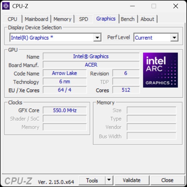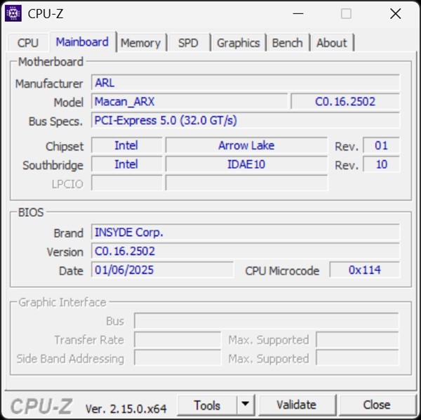 Capturi de ecran din CPU-Z cu informații despre ansamblul hardware integrat de Acer Predator Helios Neo 16 AI PHN16-73: