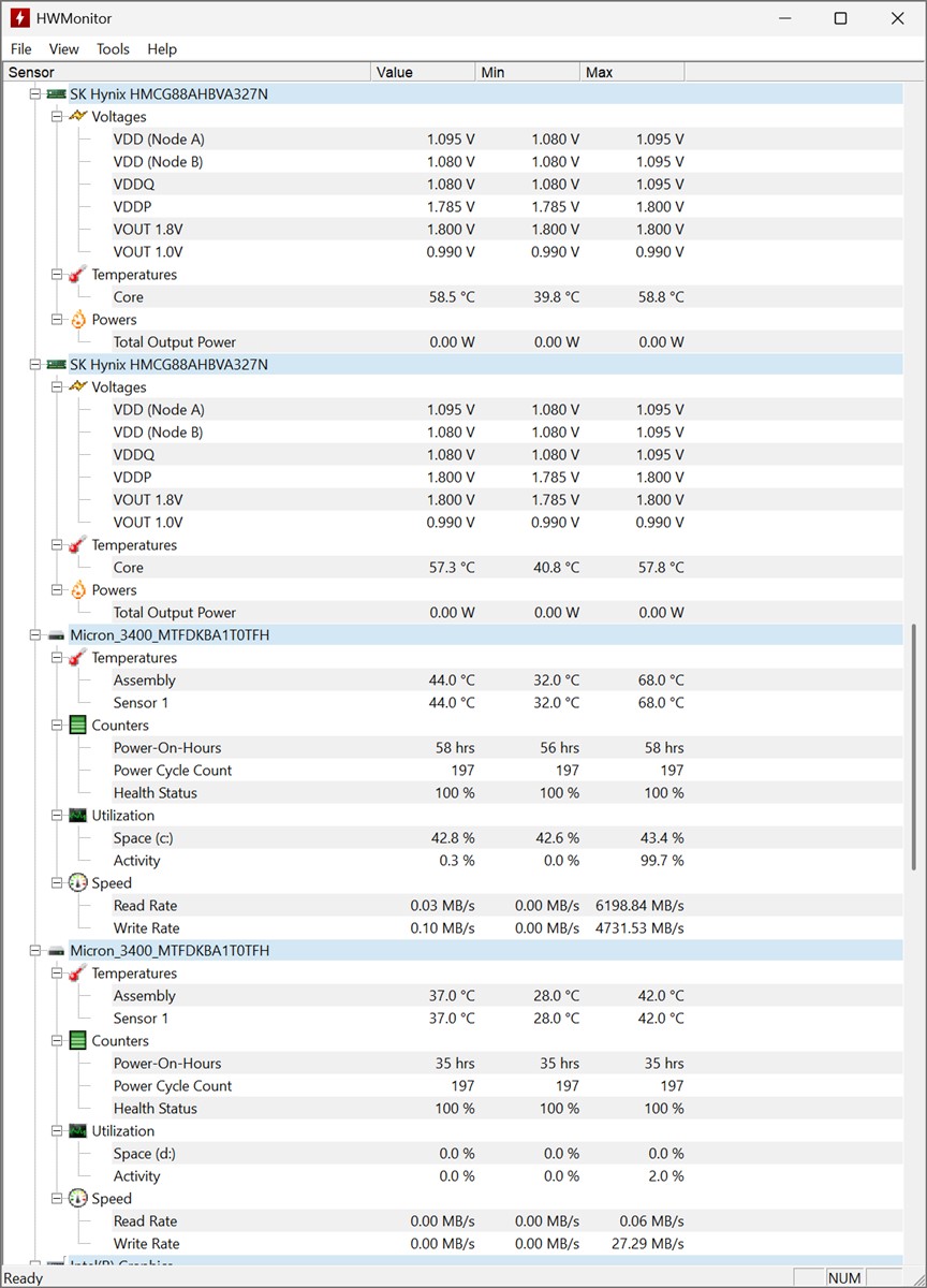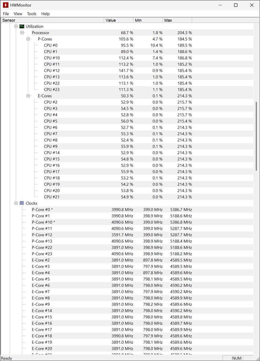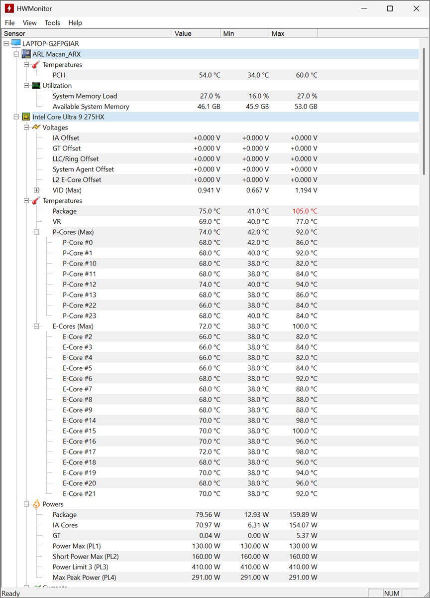 După toate încercările prin l-am trecut pe Acer Predator Helios Neo 16 AI PHN16-73 scoatem la iveală și informațiile pe care le poate furniza HWMonitor de la CPU-ID, iar cifrele sunt toate prinse în capturile de ecran de mai jos.