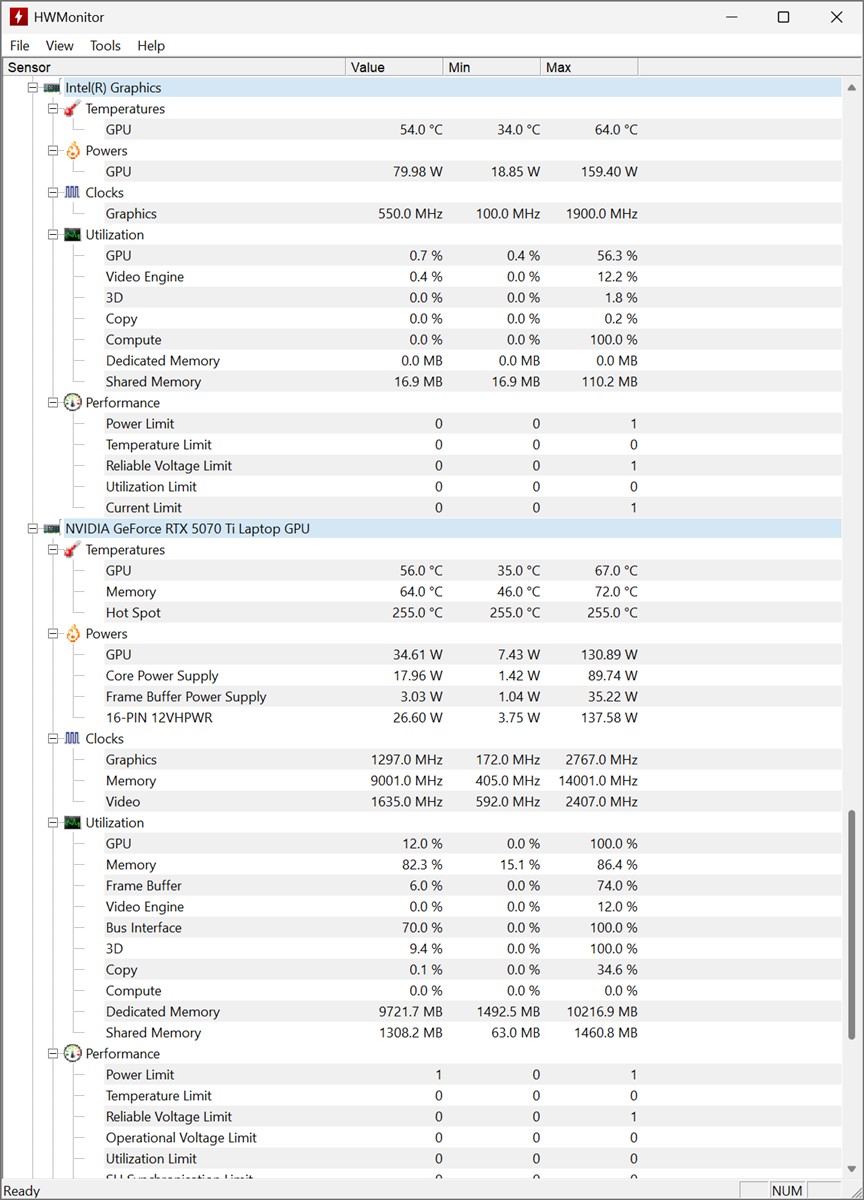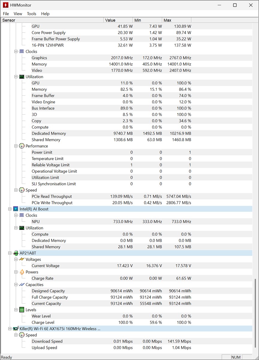 Informații preluate cu HWMonitor după testele de benchmark și jocurile rulate pe Acer Predator Helios Neo 16 AI PHN16-73: