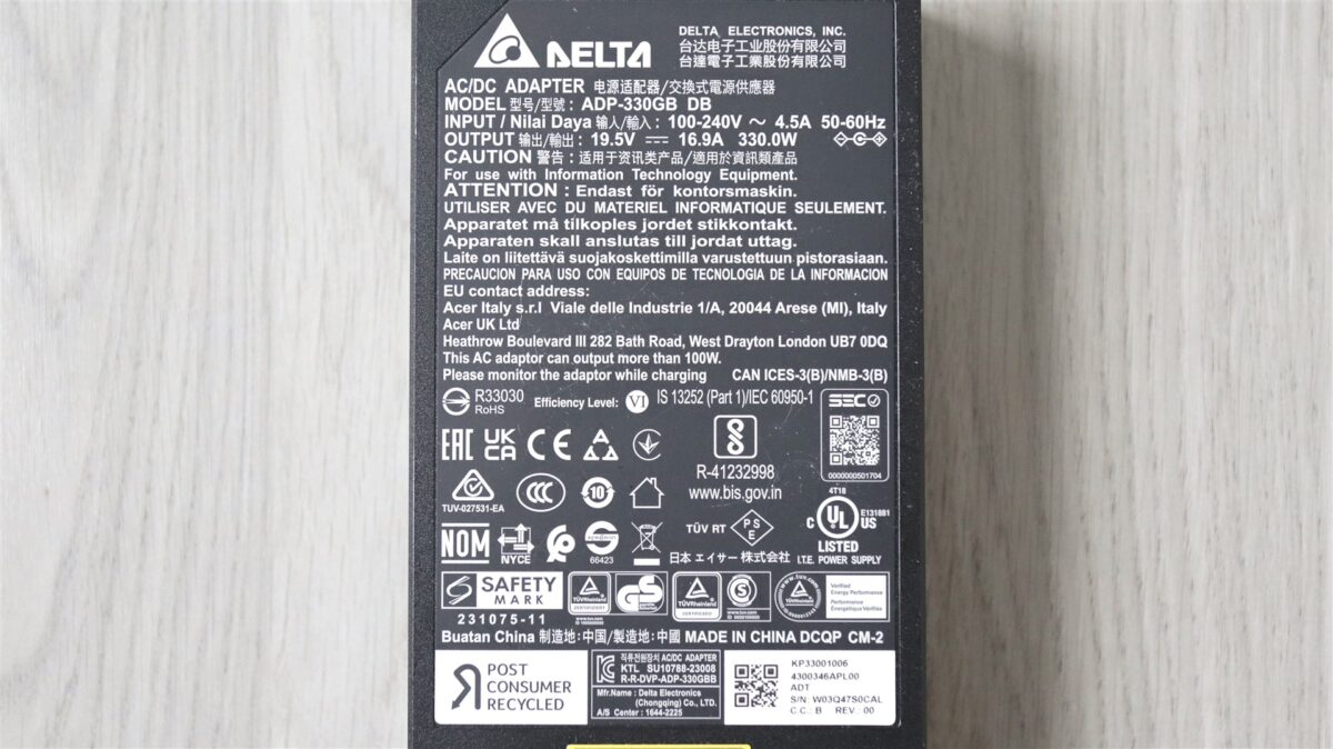 Ba chiar și adaptorul nu pare a fi întocmai cel care va ajunge la clienții de retail, nefiind cu brandul Acer, ci unul Delta. În fine, detalii mai mult sau mai puțin importante, ceea ce ar trebui să reținem de aici este că acest adaptor este destul de masiv. Dar să asta este oarecum normal, având în vedere că are o putere de nu mai puțin de 330W la ieșire.