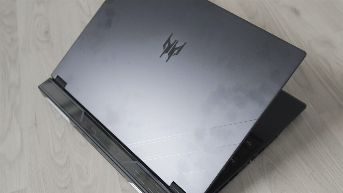 Acer Predator Helios Neo 16 AI PHN16-73 propune un design care scoate în evidență ceva trăsături tipice laptopurilor de gaming. Are pe capacul ecranului, către unul dintre colțuri, câteva linii finisate lucios, față de restul capacului care este ușor mat, iar în centru stă un logo iluminat RGB. Capacul ecranului este din aliaj de aluminiu, este zdravăn și conferă o bună rigiditate, dar prinde rapid urmele mâinilor / degetelor.