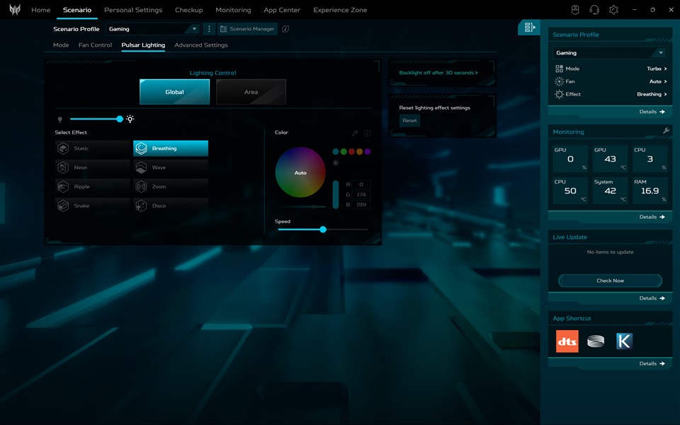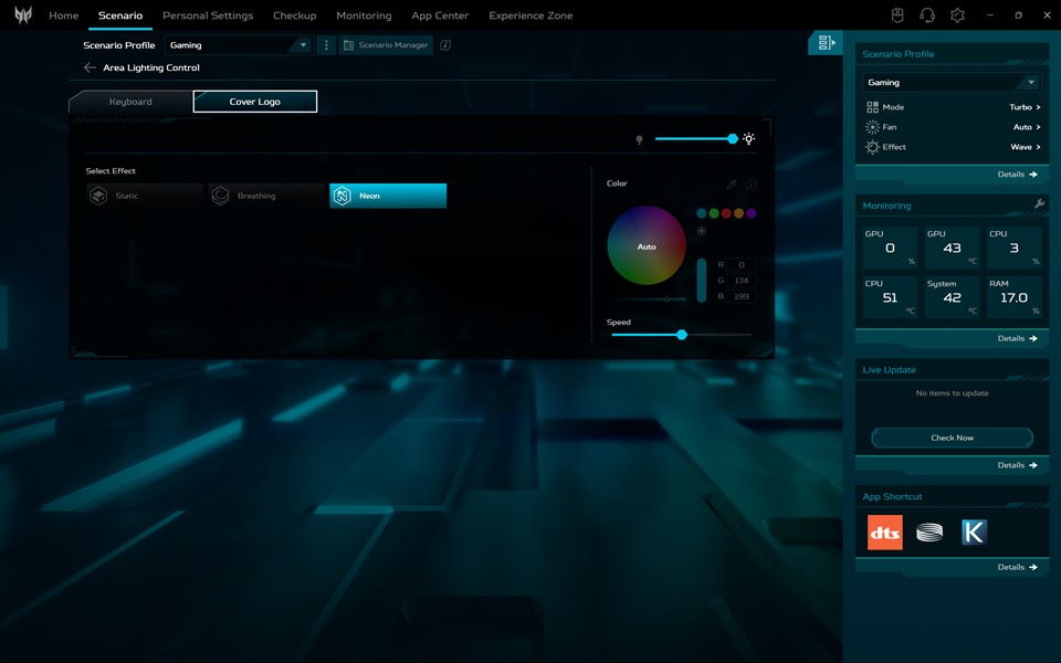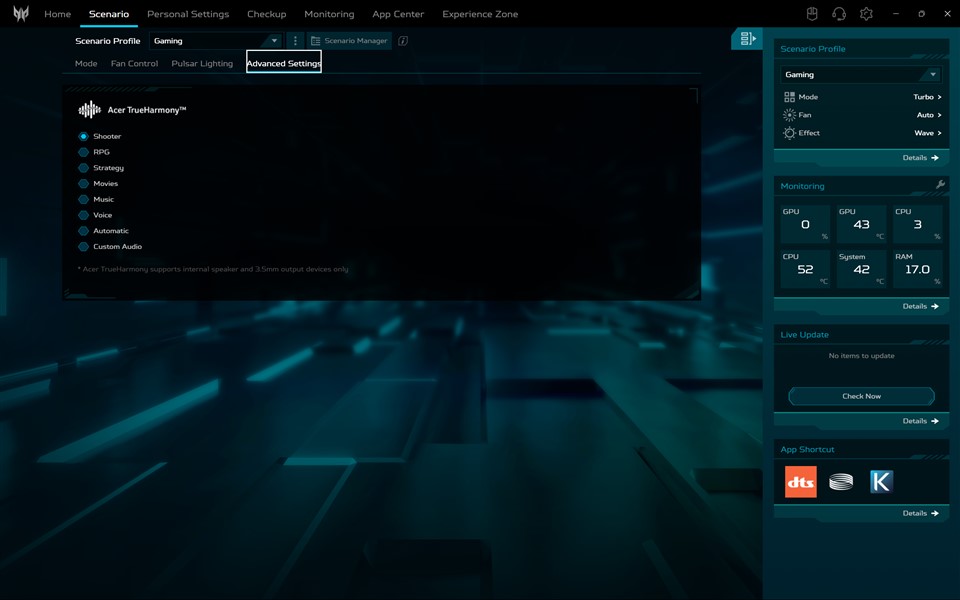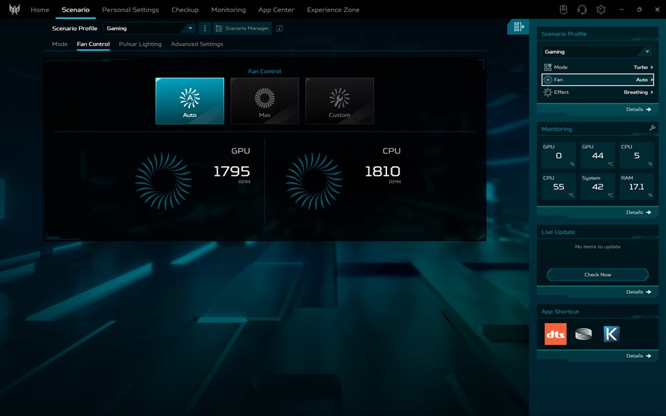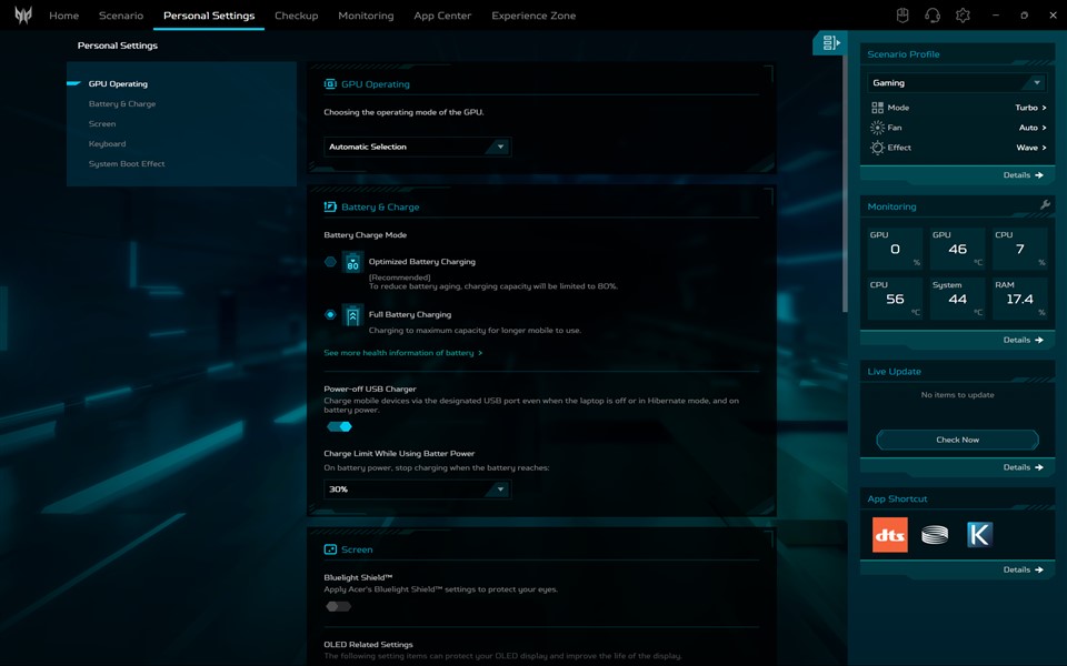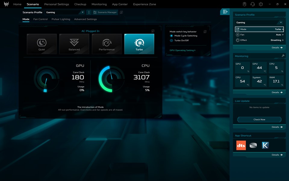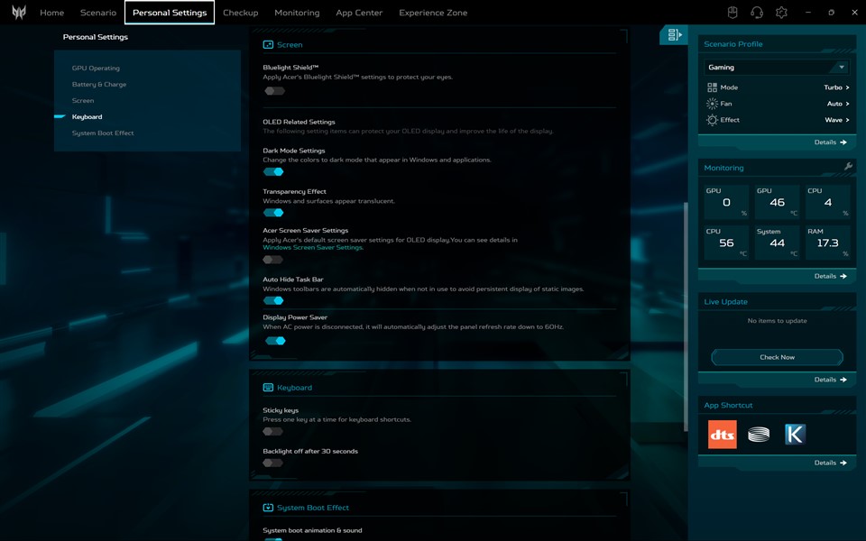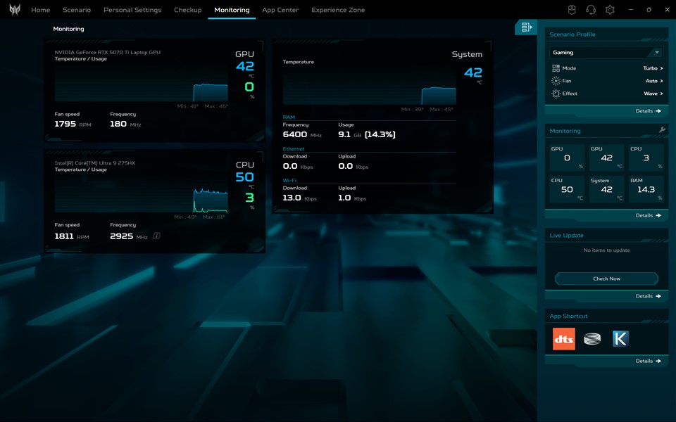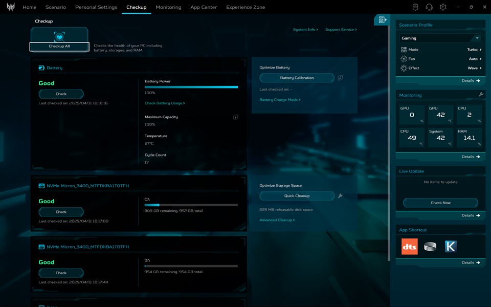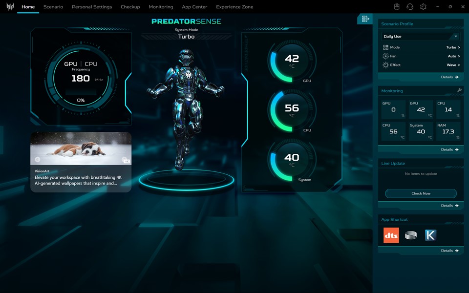 Pe laptopul de test a fost preinstalat Windows 11 Pro, care se va regăsi și pe cele unitățile de retail. Ca aplicații ce vin la pachet cu Acer Predator Helios Neo 16 AI PHN16-73 amintesc Acer Documents, Acer Jumpstart, Acer Legal Information, Acer LiveArt, Acer Product Registration, Acer Purified Voice Console, Acer QuickPanel, DTS Sound Unbound, DTS:X Ultra, ExpressVPN, Forge of Empires, Killer Intelligence Center, Lively Wallpaper, McAfee, Planet9, Realtek Audio Console și PRedatorSense, pe care am lăsat-o la urmă tocmai pentru că este cea mai importantă dintre toate. PredatorSense are multe informații, permite multe setări și ajustări, în principiu este aplicația care îți conferă cel mai extins control asupra oricărui laptop Acer Predator, deci și asupra celui de față.