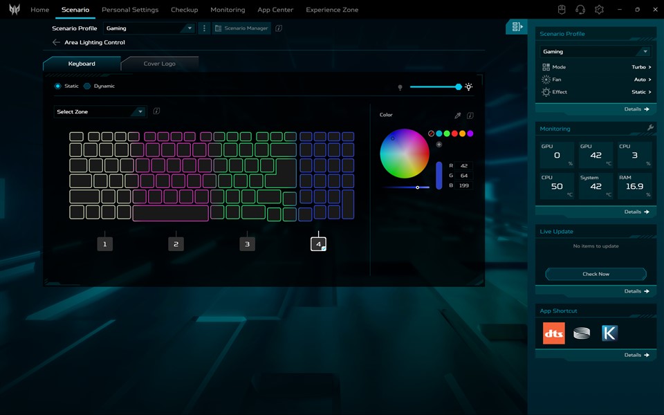 Iluminarea RGB este pe patru zone, dar modul în care uneori se face jocul de lumini, să zic, lasă impresia că este de fapt vorba despre iluminare per key. Nu-i caz, dar oricum totul foarte bine pus la punct la această tastatură.