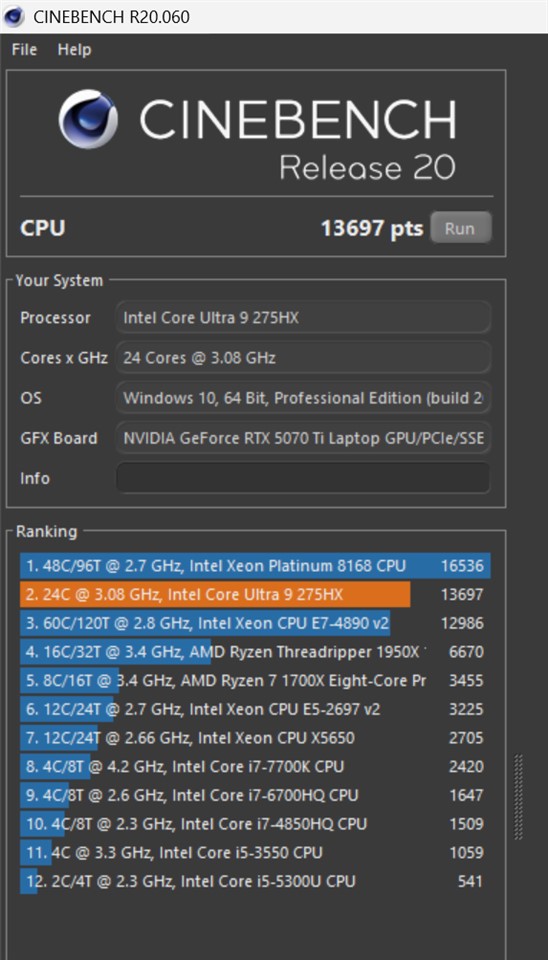 | Procesor | Intel Core Ultra 9 275HX, 24 nuclee cu 8 x Performance Cores la maxim 5.4 GHz + 16 x Efficient Cores la maxim 4.6 GHz, 24 fire de execuție, 36MB memorie Intel Smart Cache, putere de bază 55W, putere maximă Turbo 160W |