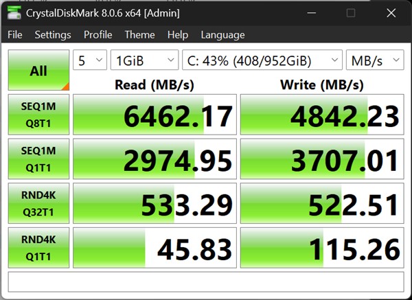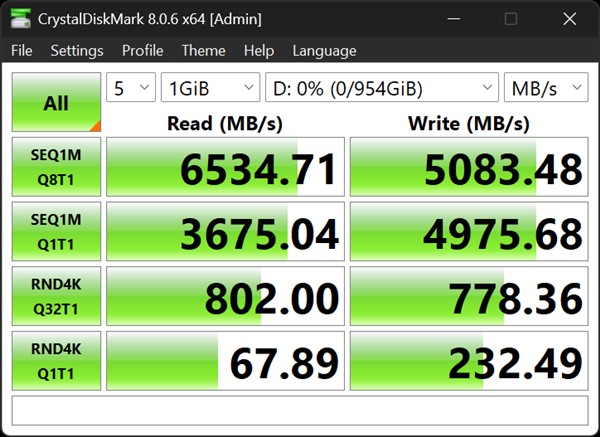 | CrystalDiskMark 8.0.5 (MB/s) SSD 1 / SSD 2 SEQ1M Q8T1 Read Write SEQ1M Q1T1 Read Write RND4K Q32T1 Read Write RND4K Q1T1 Read Write | 6462.17 / 6534.71 4842.23 / 5083.48 2974.95 / 3675.04 3707.01 / 4975.68 533.29 / 802.00 522.51 / 778.36 45.83 / 67.89 115.26 / 232.49 |