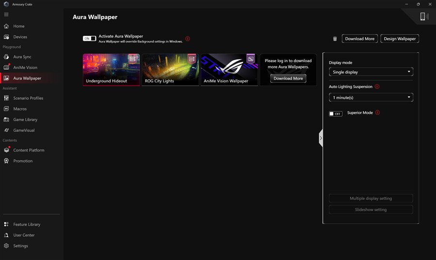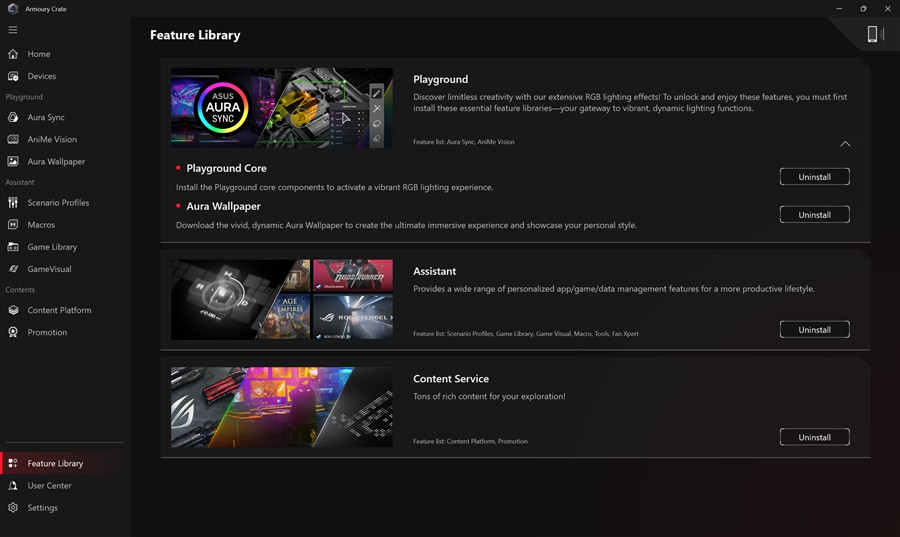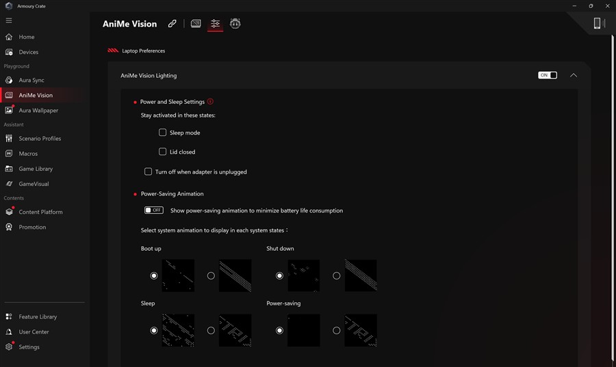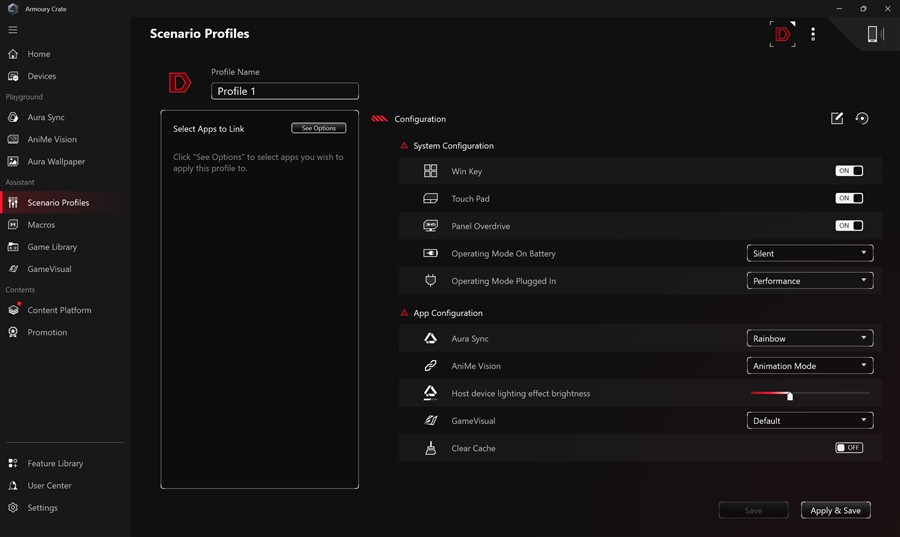Sincer, nu am înțeles de ce este nevoie atât de Armoury Crate cât și de MyASUS, cumva aceste aplicații sunt complementare. Eu am ales să fac mai toate setările din Armoury Crate, mi se pare aplicația mai completă, așa că din aceasta vă pun la dispoziție capturi de ecran.