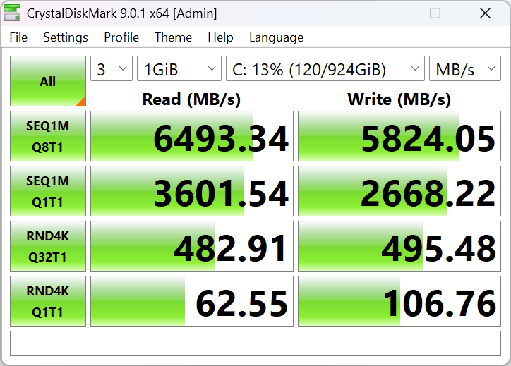 | CrystalDiskMark 9.0.1 (MB/s) SEQ1M Q8T1 Read Write SEQ1M Q1T1 Read Write RND4K Q32T1 Read Write RND4K Q1T1 Read Write | 6493.34 5824.05 3601.54 2668.22 482.91 495.48 62.55 106.76 |