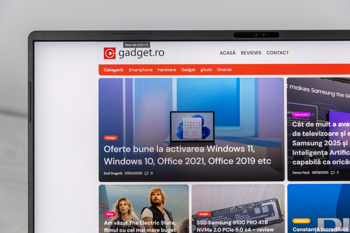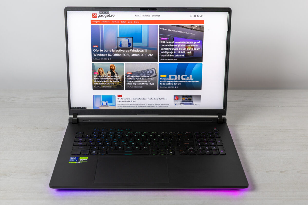 Despre ansamblul hardware vom vorbi mai mult în review-ul care va fi publicat în săptămânile următoare, aici amintesc pe scurt despre ce componente este vorba: Intel Core Ultra 9 275HX (24 nuclee cu maxim 5.4 GHz, 36MB cache, maxim 80W), NVIDIA GeForce RTX 5090 Laptop cu 24GB GDDR7, 32GB DDR5-5600 (2x16GB) și 2TB SSD M.2 PCIe 4.0 x4 + un slot suplimentar.