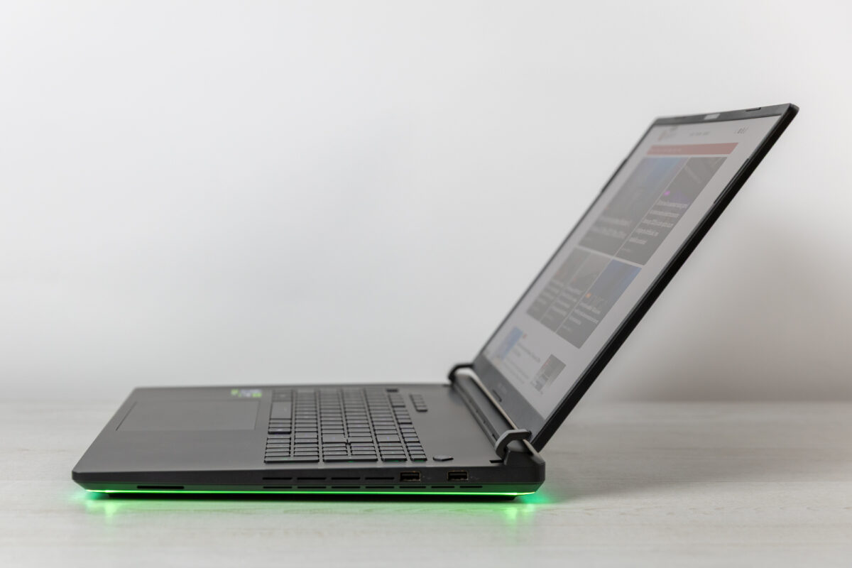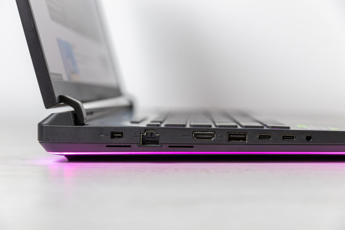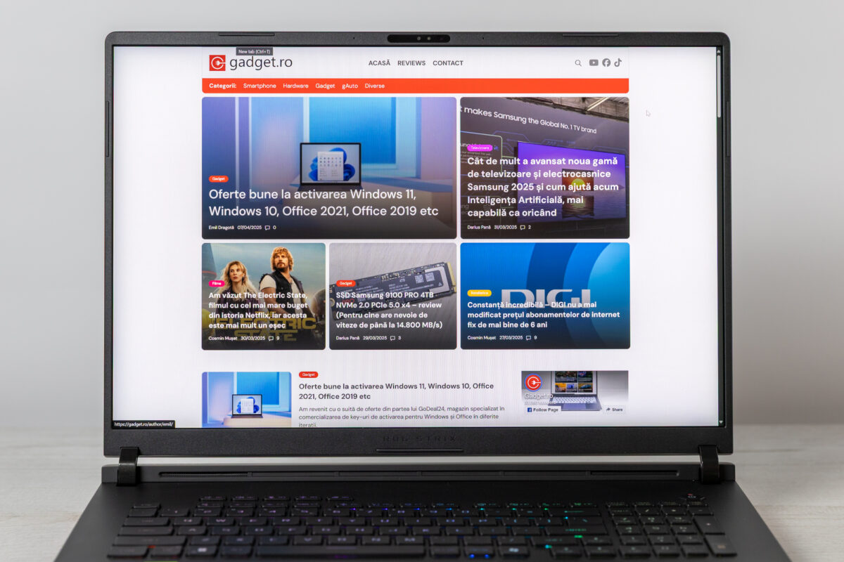 Ecranul exemplarului de față are o diagonală de 18 inch, o rezoluție 2.5K (2560 x 1600 pixeli) și un format 16:10, cifre care nu anunță multe. Doar că vorbim despre un panou Mini LED, cu peste 2000 de zone distincte de iluminare din spate, care pot genera o luminozitate maximă de 1200 niți. Este un display spectaculos din acest punct de vedere, dar nu greșește nici la viteză. Cu 240Hz, un timp de răspuns de 3 ms și suport G-SYNC ecranul reacționează rapid și fluid în orice situație. Nici culorile nu sunt deloc rele, din contră, validarea Pantone și suportul Dolby Vision certifică nuanțe vii, dar corect reproduse.