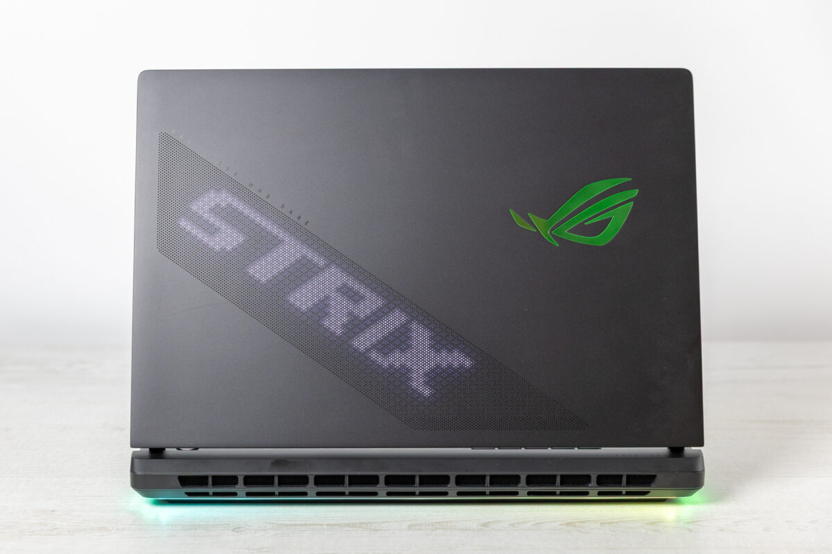 Ca design, ASUS ROG Strix SCAR 18 G835 își dorește să atragă atenția asupra sa, să-și exprime evident apartenența în segmentul de gaming. Sunt multe elemente și detalii cu adevărat speciale. Mă refer în primul rând la tot ce ține de iluminare RGB. Avem pe zona de jos o bandă RGB care se întinde pe tot perimetrul laptopului și care creează impresia că dispozitivul plutește cumva deasupra mesei, biroului. Apoi, este logo-ul ROG de pe capacul ecranului, și el cu iluminare RGB, pentru ca nu în ultimul rând să amintesc și de tastatura cu iluminare RGB per key.