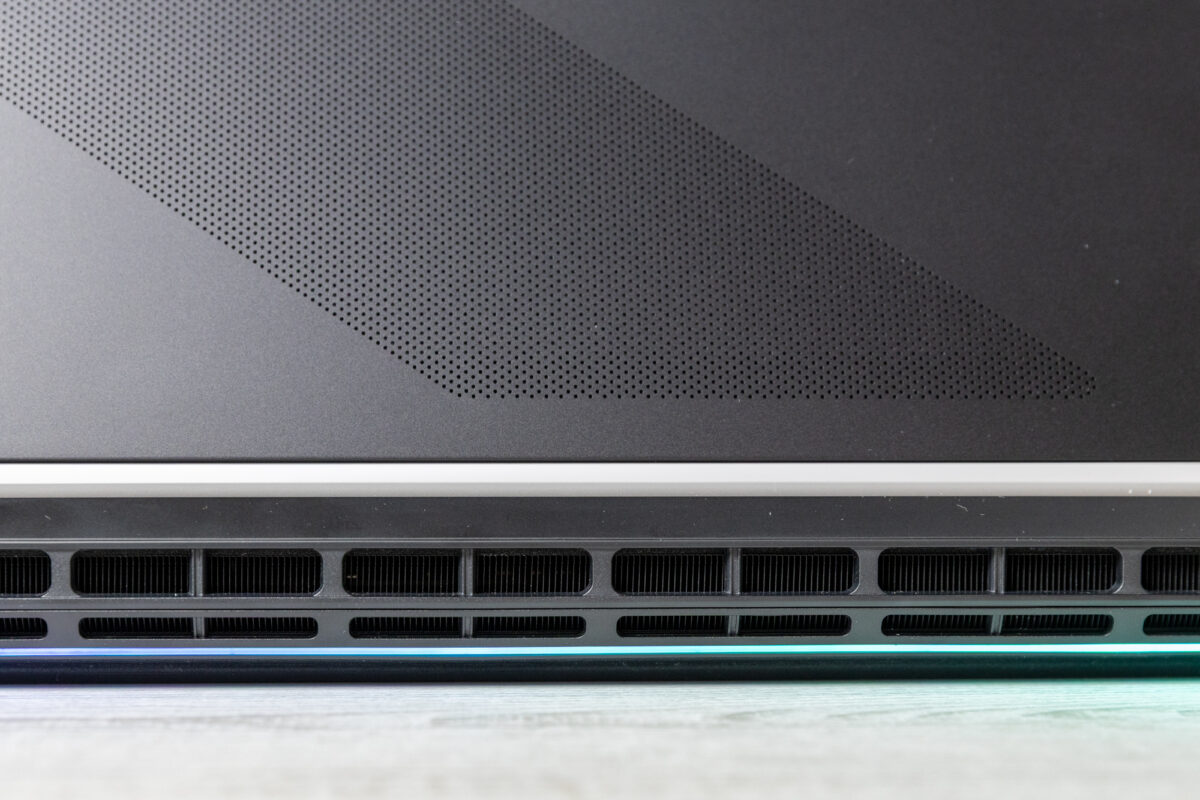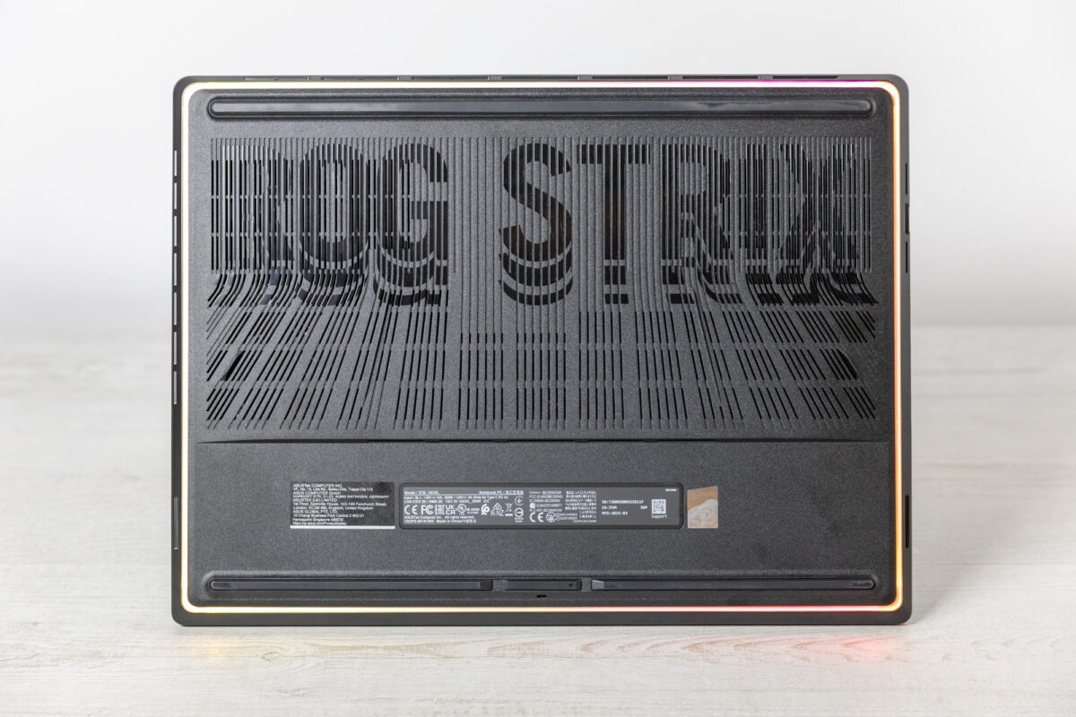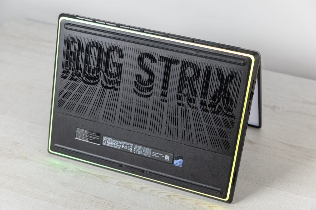 Pe partea de jos, observăm o suprafață extinsă pentru aerisire, cu un model foarte interesant pentru denumirea ROG STRIX, care produce un efect vizual 3D. Foarte ingenioasă abordarea.
