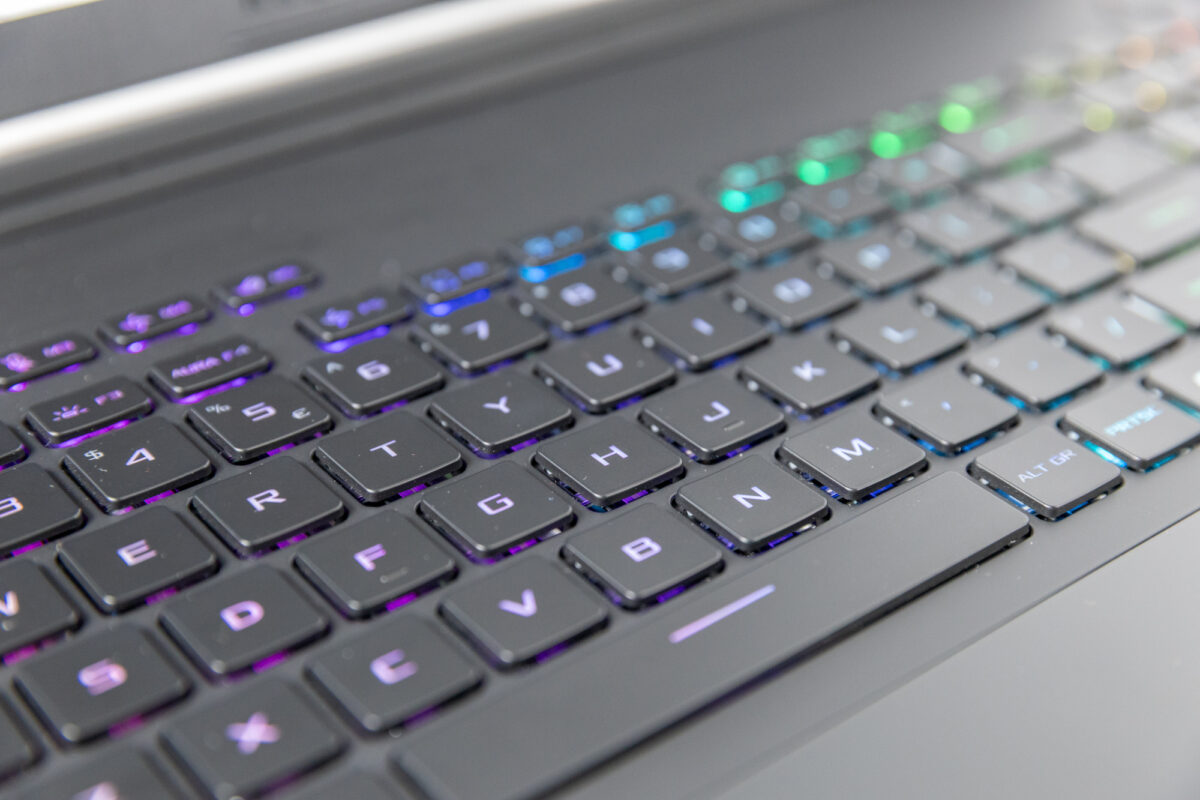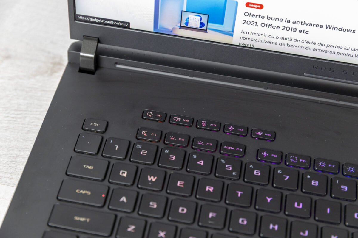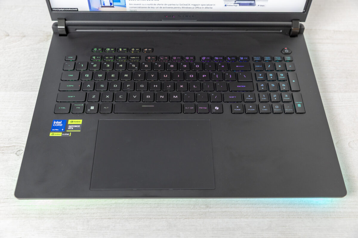 Sunt și câteva taste Multimedia suplimentare, cinci la număr, care se adaugă celor Function, care și ele pot îndeplini anumite funcții separate. Iluminarea RGB per key este complet personalizabilă și arată foarte bine. Touchpad-ul are dimensiuni foarte generoase și permite un control exact, însă pentru gaming vom avea nevoie de un mouse dedicat, desigur.