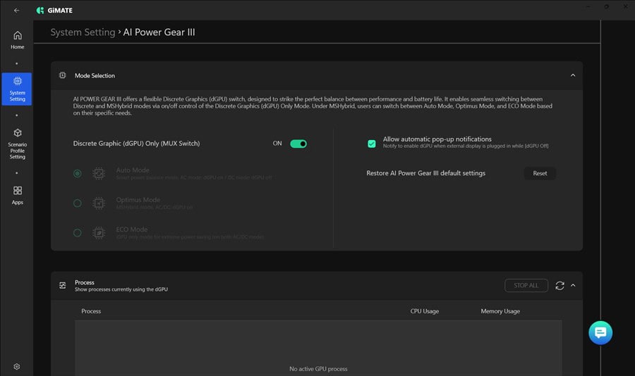🔺Utilitarul AI Power Gear III încearcă să eficientizeze la maximum consumul pe partea de randare 3D prin comutarea inteligentă între placa video dedicată NVIDIA și cea integrată.