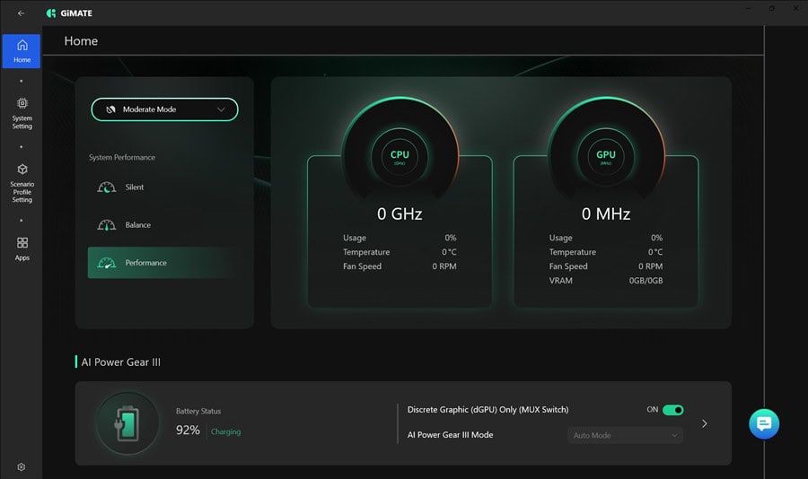 Din punct de vedere software, un GIGABYTE Gaming A16 (GA6H) vine cu Windows 11 Home preinstalat, pe care îl știm cu toții prea bine. Ca aplicații ce vin la pachet cu acest laptop merită neapărat să vorbim despre GiMATE, software-ul care îți aduce într-o interfață prietenoasă și simplu de parcurs câteva opțini de personalizare și de optimizare.