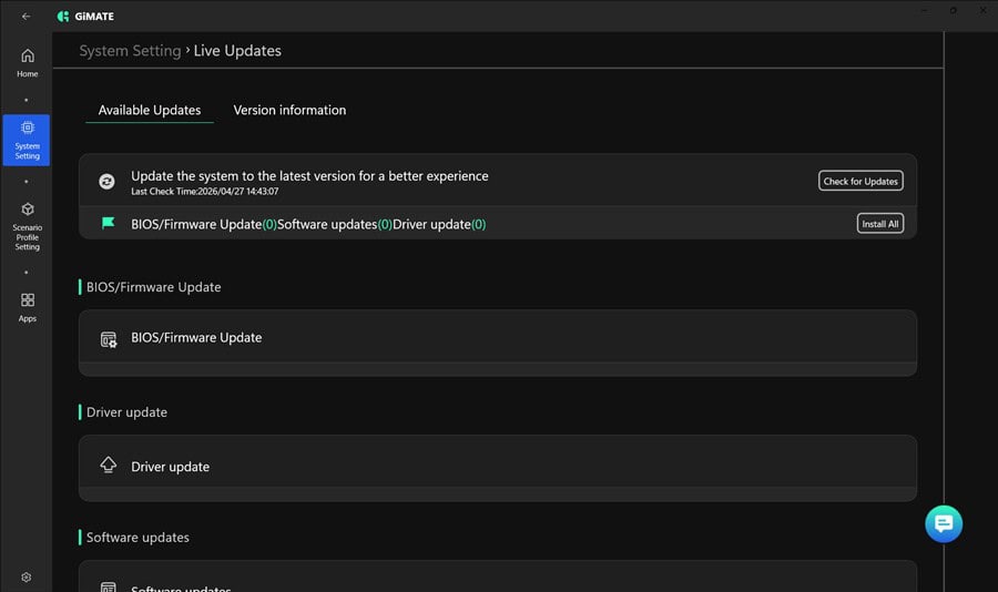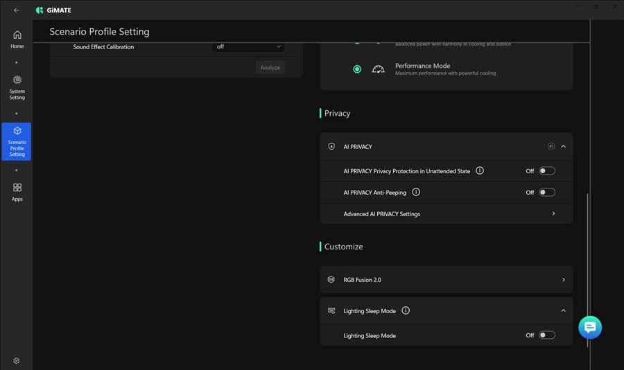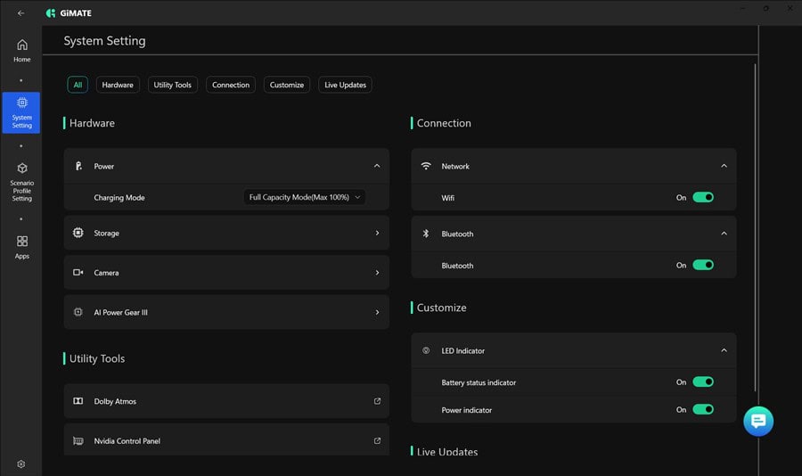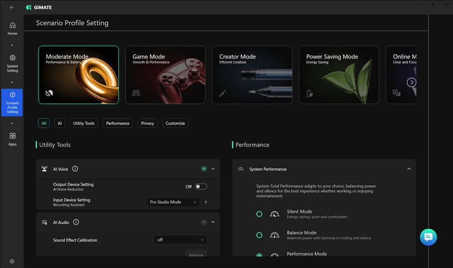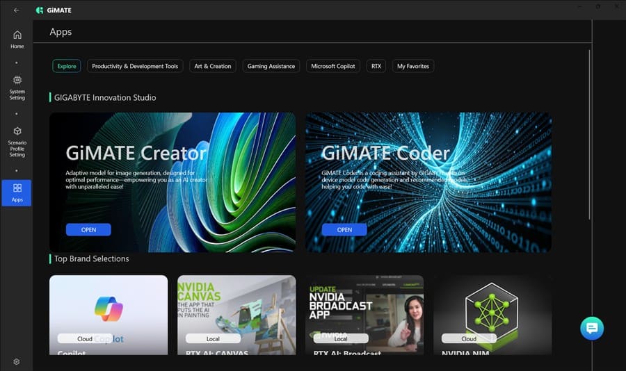 Îmi place secțiunea de update-uri, unde se face automat inclusiv update de BIOS, facil și fără emoții. Dar și mai mult impresionează zona de AI, unde sunt două aplicații extrem de interesante – GiMATE . Foarte important este că ambele pot rula local, deci îți este asigurată confidențialitatea.