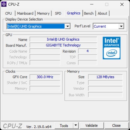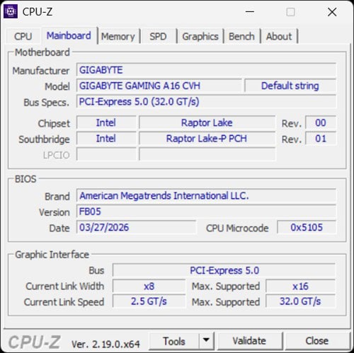 Capturi de ecran din CPU-Z cu informații despre ansamblul hardware integrat de GIGABYTE Gaming A16 (GA6H):
