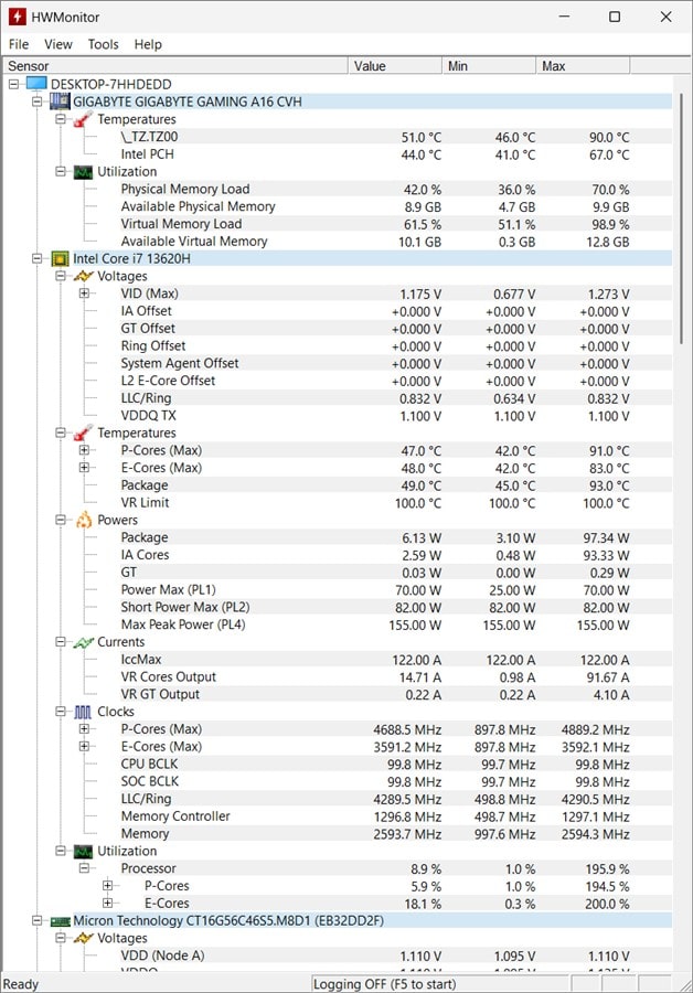 Informații preluate cu HWMonitor după testele de benchmark rulate pe GIGABYTE Gaming A16 (GA6H):