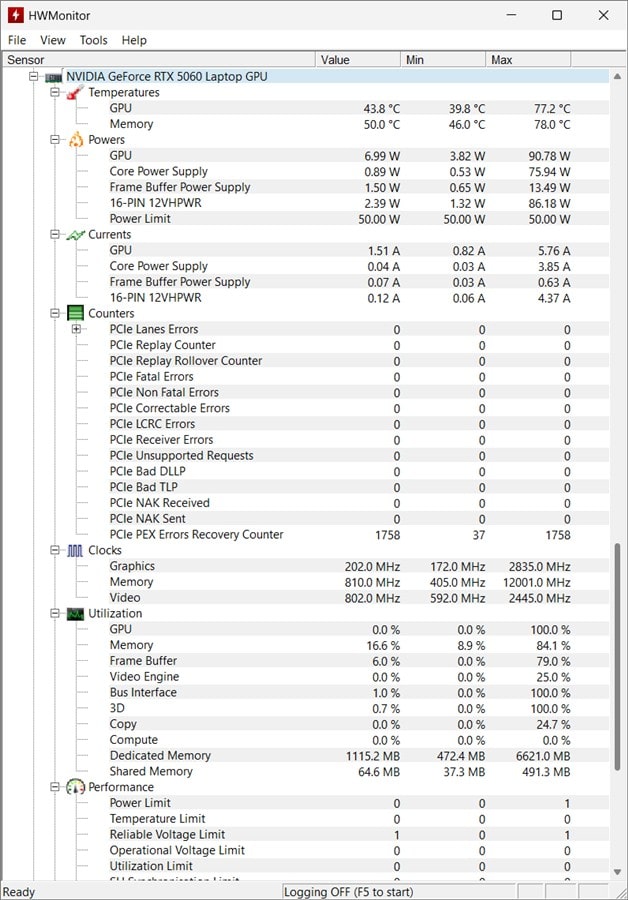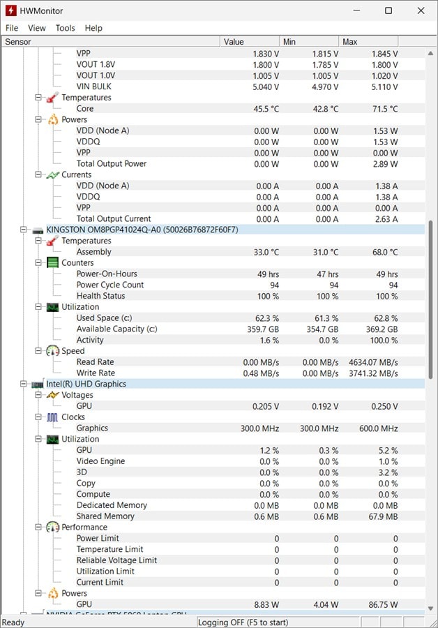 În timpul testelor, HWMonitor a rulat în fundal și a înregistrat date prețioase pe care le putem analiza din imaginile următoare.