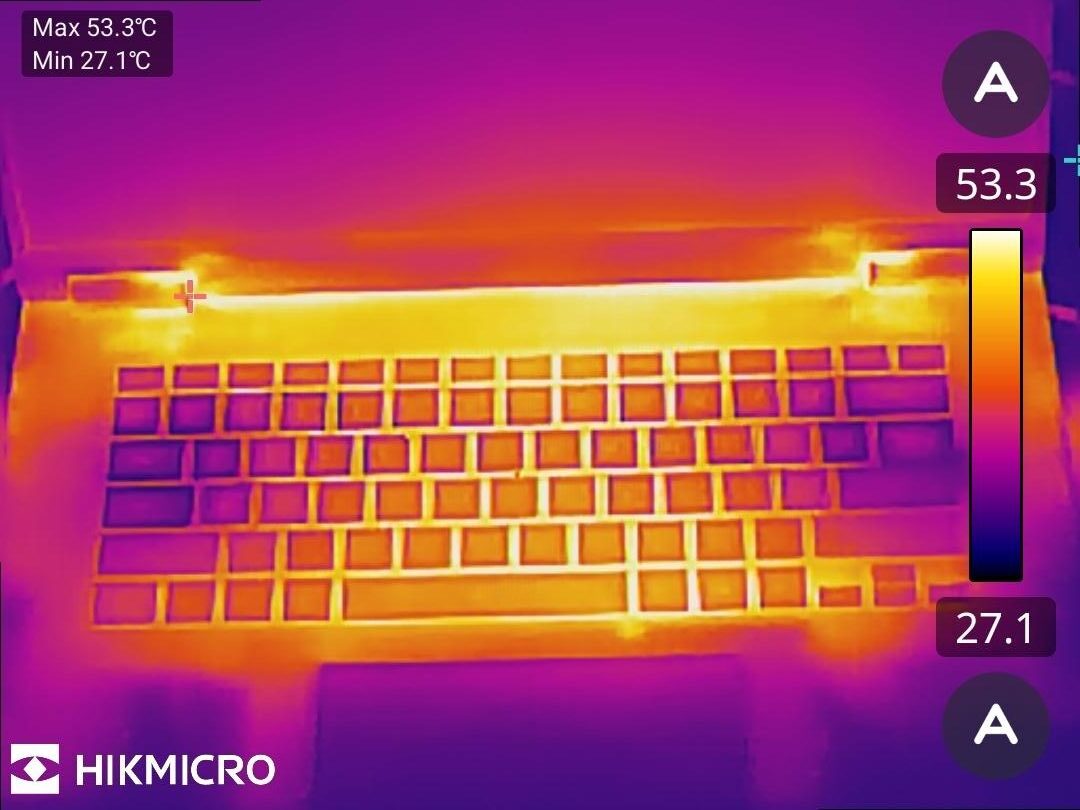 Observăm însă din poza de mai sus că laptopul se încălzește cel mai tare undeva în zona balamalelor, deci nu acolo unde ții mâinile în mod obținut. La tastatură sunt câteva grade Celsius în minus, atât cât să acea zonă să nu devină deranjantă nici după zeci de minute de gaming greu.