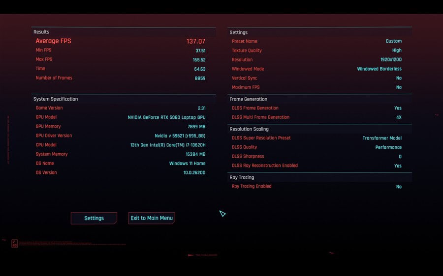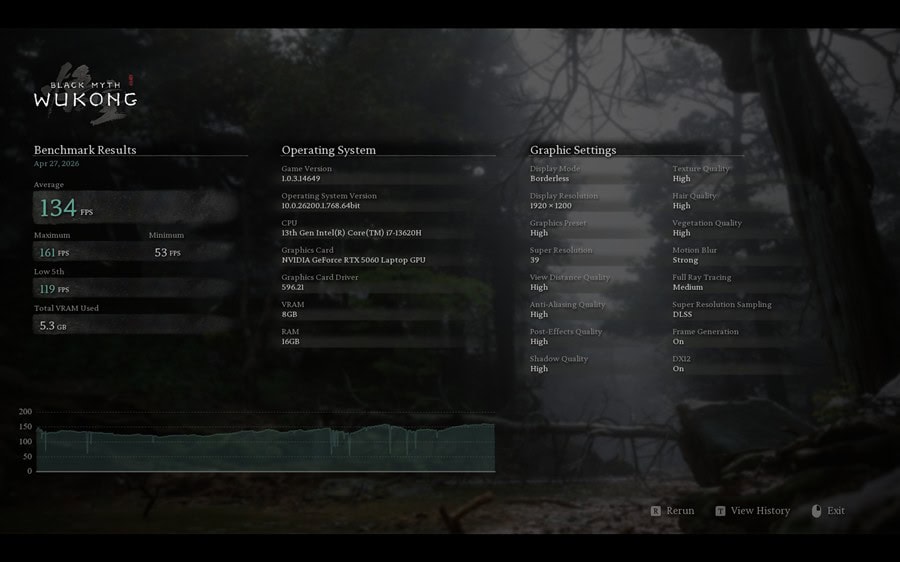 Am rulat rapid și testele de benchmark din Black Myth: Wukong și Cyberpunk 2077, iar toate informațiile pot fi parcurse prin capturile de ecran de mai jos (rezoluție, detalii, tehnologii active, fps etc):