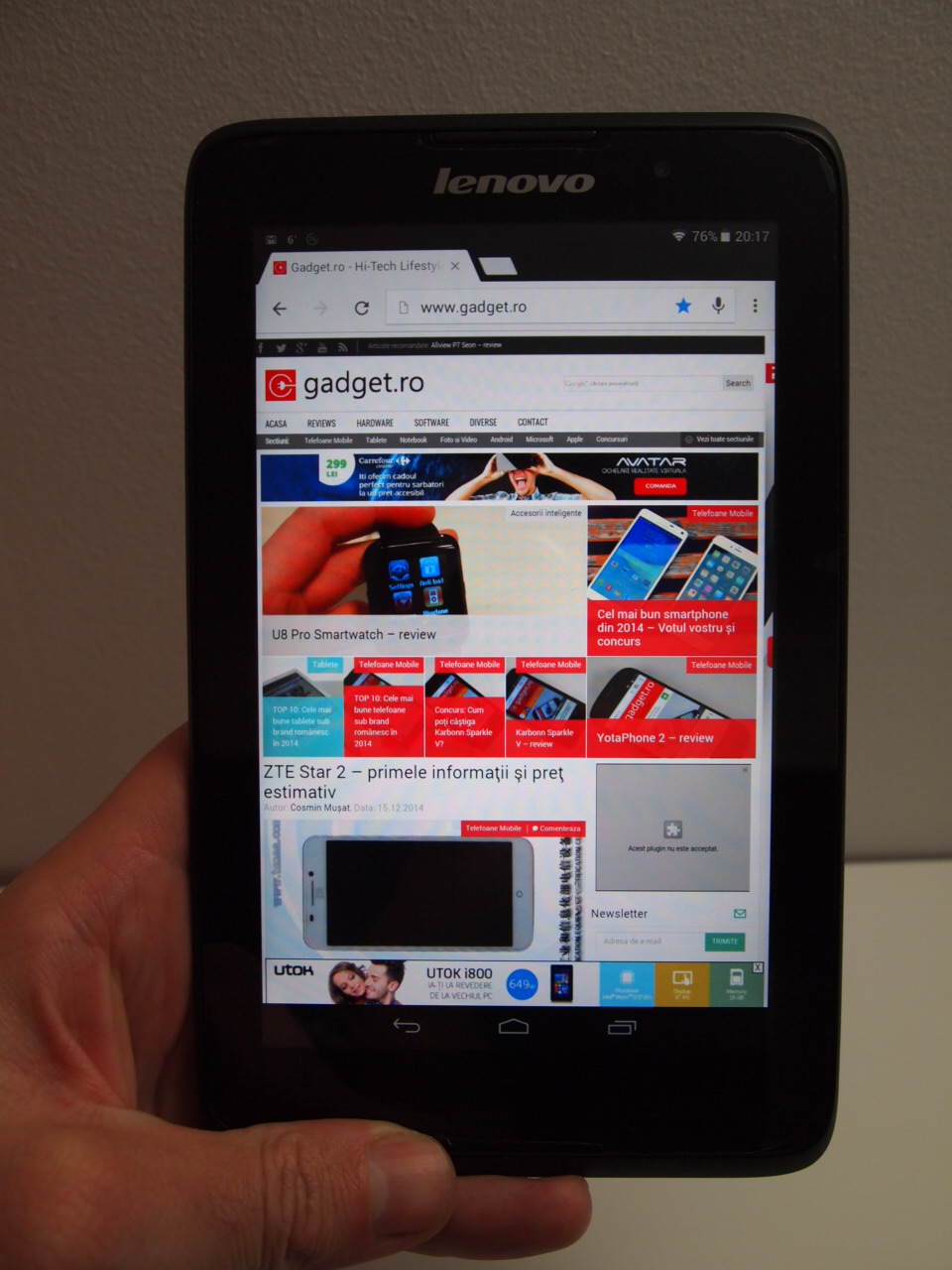 Al doilea element care m-a făcut să aleg acest model a fost ecranul. Majoritatea tabletelor de 7 inci cu preț asemănător oferă o rezoluție mai mică decât cea de la Lenovo A3500. Cu 1280 X 800 pixeli pe această diagonală reiese o densitate de 216 ppi, ce se dovedește suficientă. Mai mult, display-ul este de tip IPS și oferă culori foarte plăcute. Unghiurile de vizualizare și luminozitatea puteau fi mai bune, dar per total ecranul este unul bun, mai ales pentru o tabletă care m-a costat 249 lei.