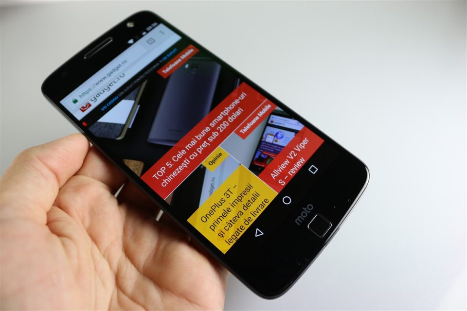 Tot în partea spate se remarcă conectorul magnetic ce permite conexiunea cu Moto Mod-urile ce pot fi achiziționate în mod separat. Camera de 13 Megapixeli cu OIS are un design circular, senzorul propriu-zis + dublu LED flash-ul. În partea frontală, la baza display-ului se află sigla Moto și cititorul de amprentă ce nu are rol și de tastă fizică în controlul meniului. Sunt sigur că Lenovo ar fi putut să adauge și două taste capacitive, în dreapta și stânga senzorului de amprentă, în acest mod i-ar fi mulțumit și pe cei ce nu-și doresc controale de tip touch buttons în interfața smartphone-ului, a la Nexus.