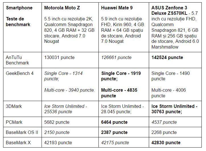 L-am comparat cu Huawei Mate 9 și ASUS Zenfone 3 Deluxe ZS570KL. Display-ul 2K îl pune la lucru în mod susținut, de aici și performanțe ceva mai slabe față de cei doi contracandidați.