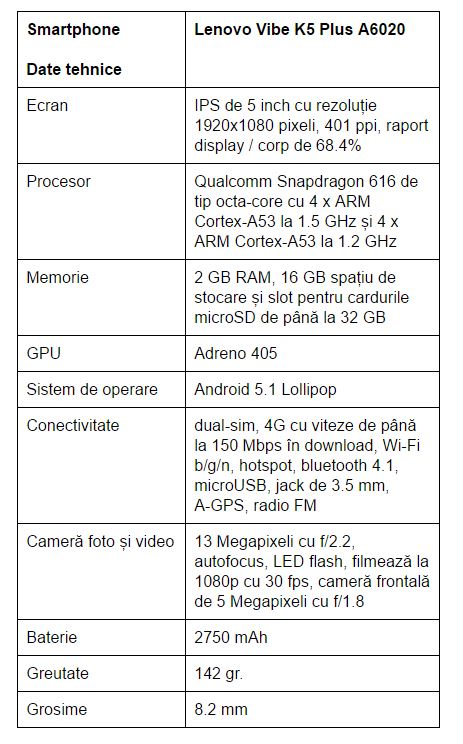 Folosește un procesor pe care l-aș considera ușor îmbătrânit, dar și un software pe care l-aș eticheta în fix același mod. Lenovo Vibe K5 Plus = Qualcomm Snapdragon 616 de tip octa-core pe structură big.LITTLE cu 4 x ARM Cortex-A53 la 1.5 GH și 4 x ARM Cortex-A53 la 1.2 GHz, Adreno 405 în poziția de accelerator grafic, 2 GB RAM și 16 GB spațiu de stocare + slot pentru cardurile microSD.