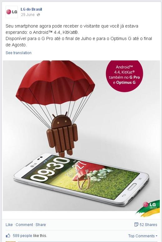 Cu toată agitaţia existentă zilele acestea în Brazilia datorită Campionatului Mondial de Fotbal, reprezentanţa locală LG a anunţat pe pagina sa de Facebook faptul că LG Optimus G va primi update-ul către Android 4.4.2 KitKat până la sfârşitul lunii august, iar LG Optimus G Pro până la sfârşitul lunii iulie.