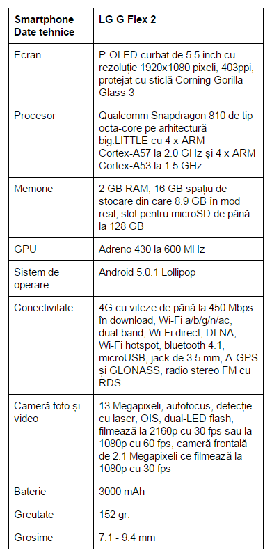 Sunt 2 versiuni de LG G Flex 2: prima cu 2 GB RAM și 16 GB spațiu de stocare / cea testată și de mine și a doua cu 3 GB RAM și 32 GB spațiu de stocare, care nu cred că va ajunge în România pe canal oficial.