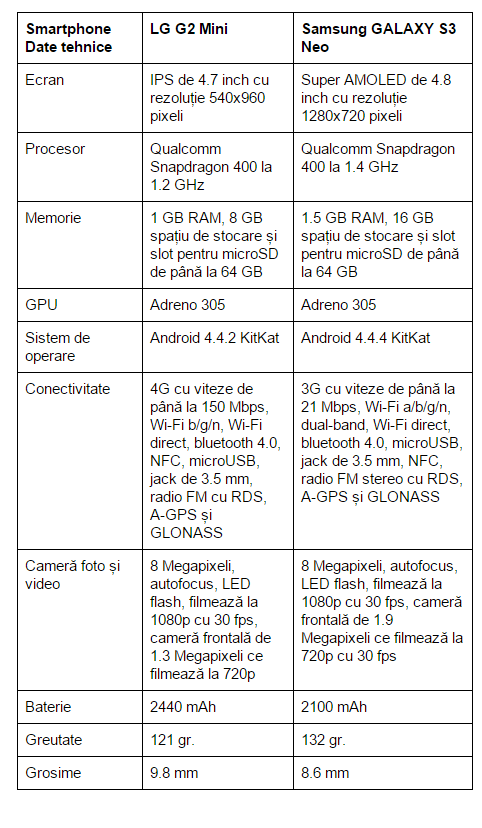 Recomand LG G2 Mini-ul pentru autonomia sa, concepția mai modernă. Samsung GALAXY S3 Neo este predispus la unele probleme (plasticul care se exfoliază, spre exemplu). Ambele telefoane sunt alternative viabile la smartphone-urile B-list cu preț de sub 1000 lei.