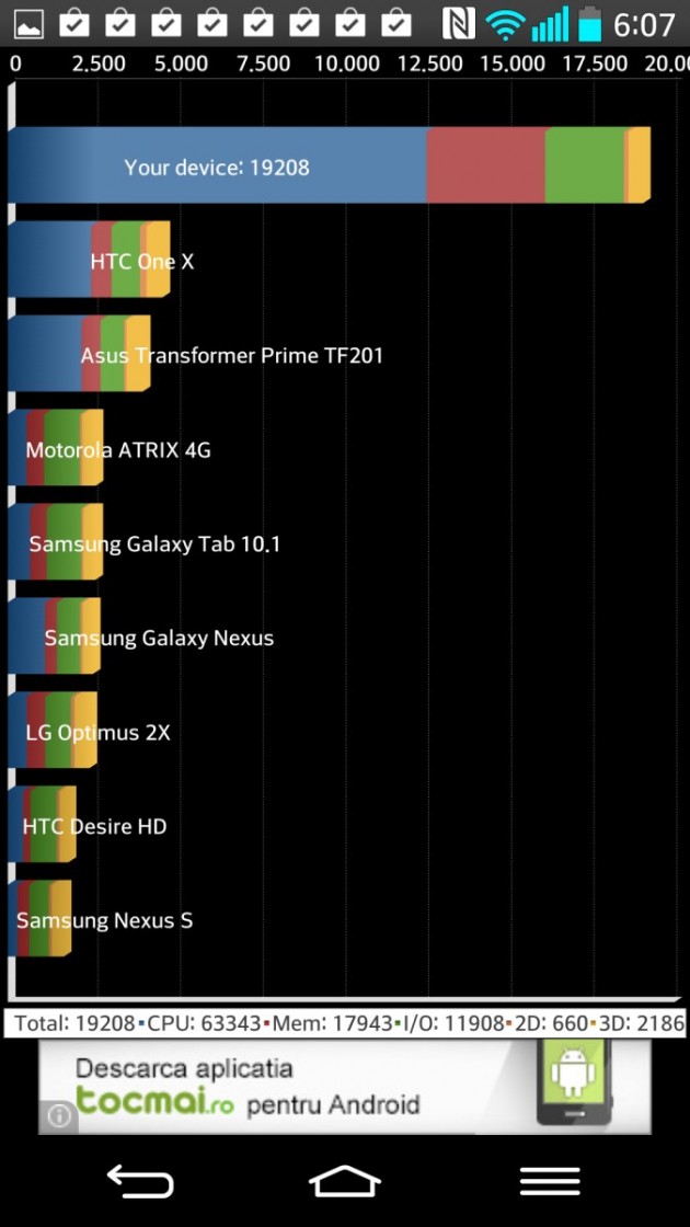 A trecut și prin câteva teste de benchmark. Trebuie să precizez că era un sample sosit de la LG România și nu versiunea de retail. De aici poate și faptul că la rularea unor teste de benchmark s-a încălzit destul de tare și s-a restartat singur.