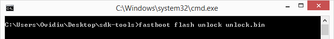 11. Cu telefonul în modul bootloader, tastează și execută comanda fastboot flash unlock unlock.bin . În acest moment fastboot va debloca bootloaderul telefonului tău LG G4 folosind cheia din fișierul unlock.bin.