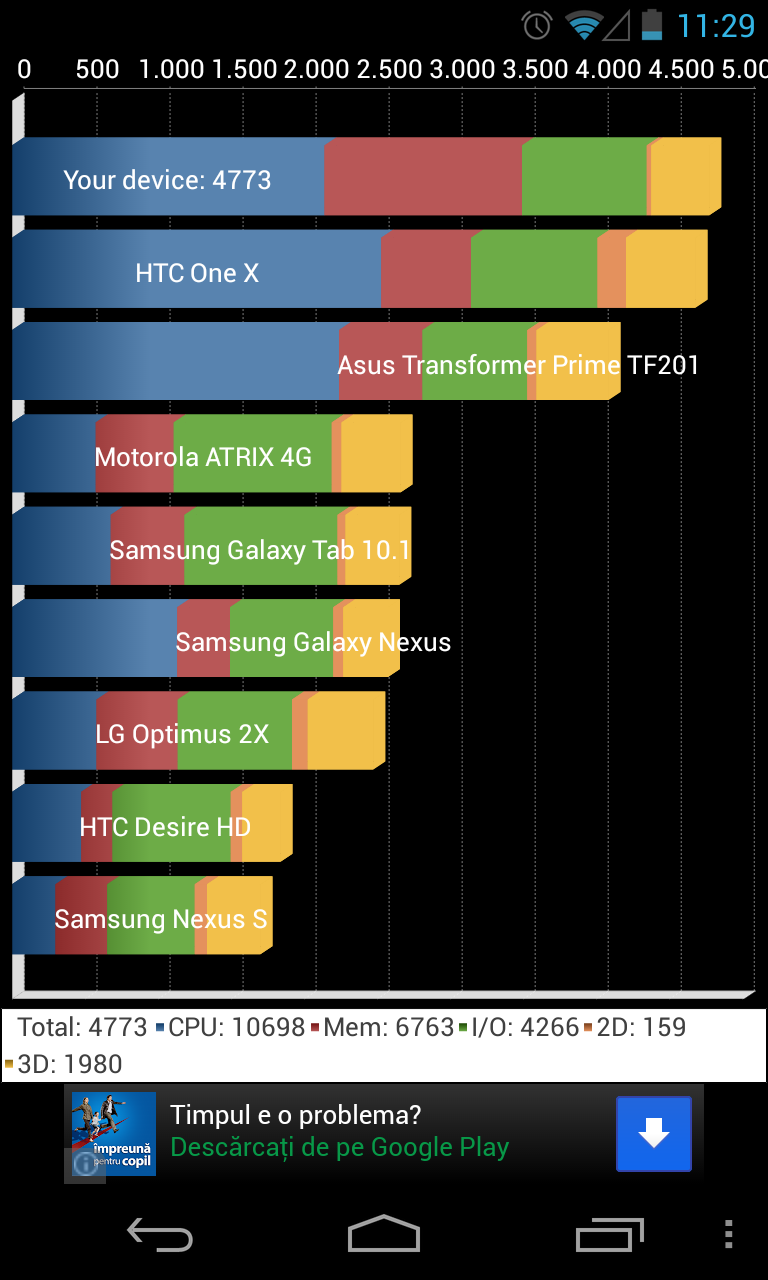 Soluție hardware de top, cel mai performant CPU + GPU + memorie RAM destul de mare: Qualcomm quad-core la 1.5 GHz, 2 GB RAM, Adreno 320 GPU. Spațiul de stocare la modelul testat era de 16 GB. Aș zice că-i ok, deși o variantă de 32 GB s-ar fi potrivit perfect. Atunci când îți cumperi un smartphone de top înseamnă că vrei să-l folosești la maxim. Să ai o sumă de jocuri pe el, să ai muzica cu tine și uneori la un drum mai lung să poți pune și 1 / 2 / 3 filme. Cei 16 GB sunt ok, dacă mă gândesc că în afară de MarketOnline celelalte magazine vând la preț mai mare pe cel de 8 GB. Spațiul de stocare este unul dintre punctele negative majore la Nexus 4.