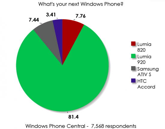 Potrivit unui sondaj realizat de WPCentral în care aceștia și-au întrebat cititorii ce telefon cu Windows Phone 8 ar/vor cumpăra, 81.4% dintre aceștia au ales Lumia 920 drept câștigător. Variantele dintre care aceștia mai puteau să aleagă erau Lumia 820, Samsung ATIV S și HTC Accord (dispozitiv încă nelansat). Deși de obicei în sondaje diferența dintre smartphone-uri este relativ mică, se pare că Nokia a dat lovitura și a monopolizat situația.