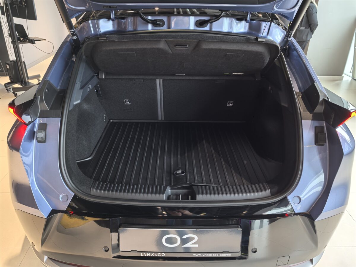 Legat de spațiul interior, din nou foarte bine, Lynk & Co 02 pune la dispoziția pasagerilor mai mult loc decât mă așteptam raportat la dimensiunile exterioare. Pe banchetă se stă confortabil, doi adulți au spațiu suficient pe orice deirecție, dar mai ales la genunchi am observat că este din belșug. Pe scaunele față poziția poate fi găsită facil, reglajele electrice ale scaunelor sunt ample, la fel pentru volan, aici cu reglaj manual. Portbagajul nu sparge recorduri pentru acest segment, are 410 litri, deci nimic special, dar măcar există o podea dublă, sub care este loc pentru cablurile de încărcare și alte obiecte de mici dimensiuni.