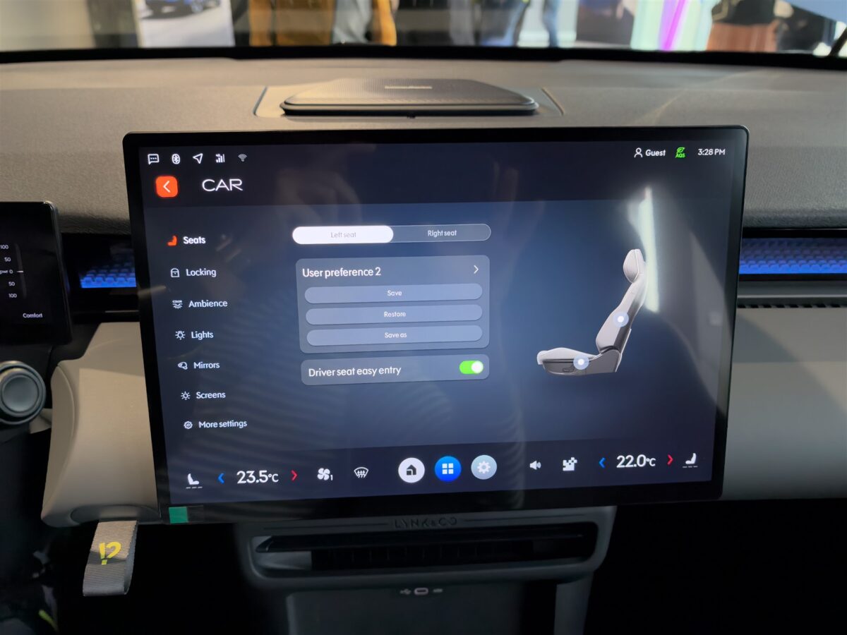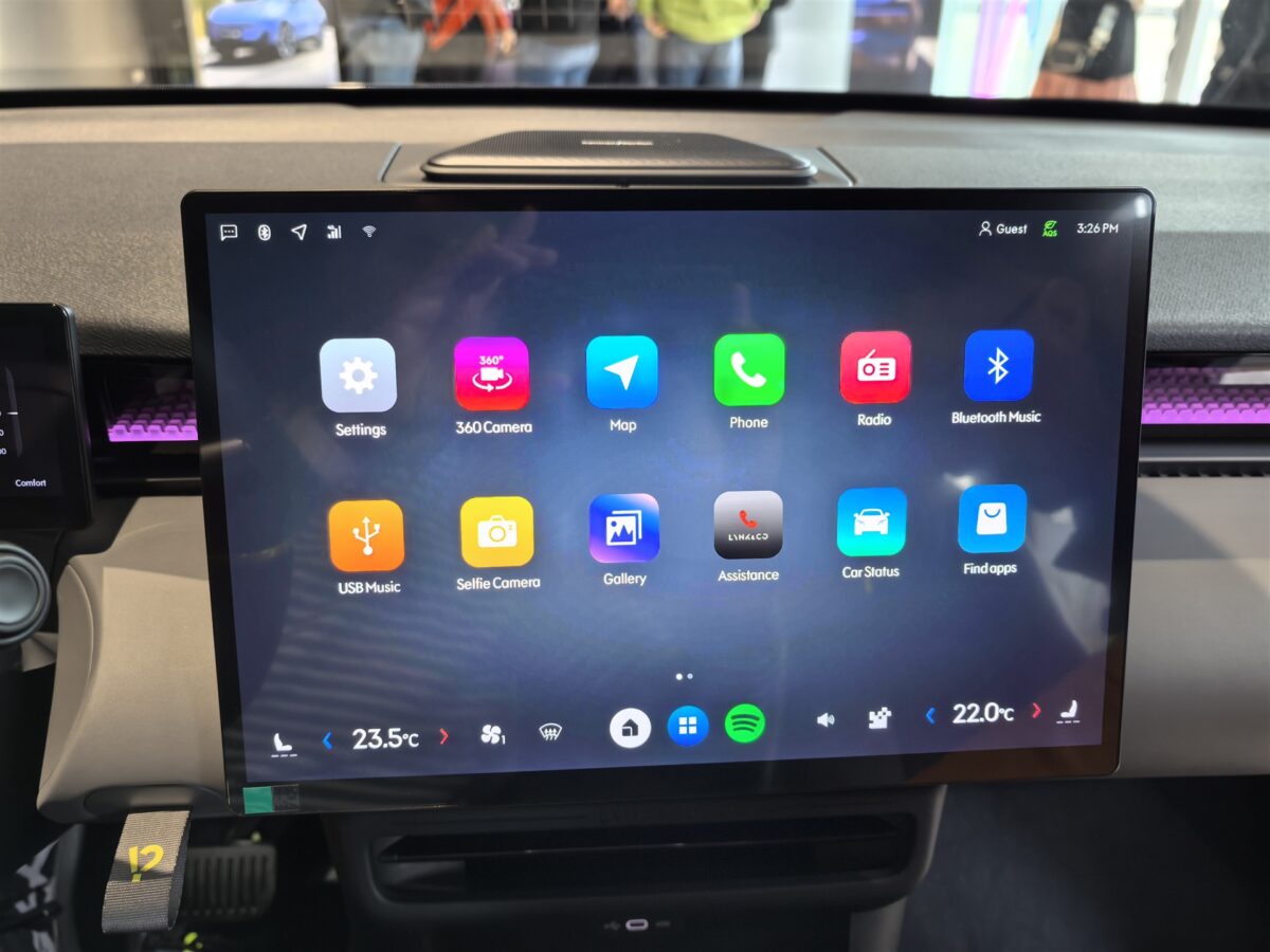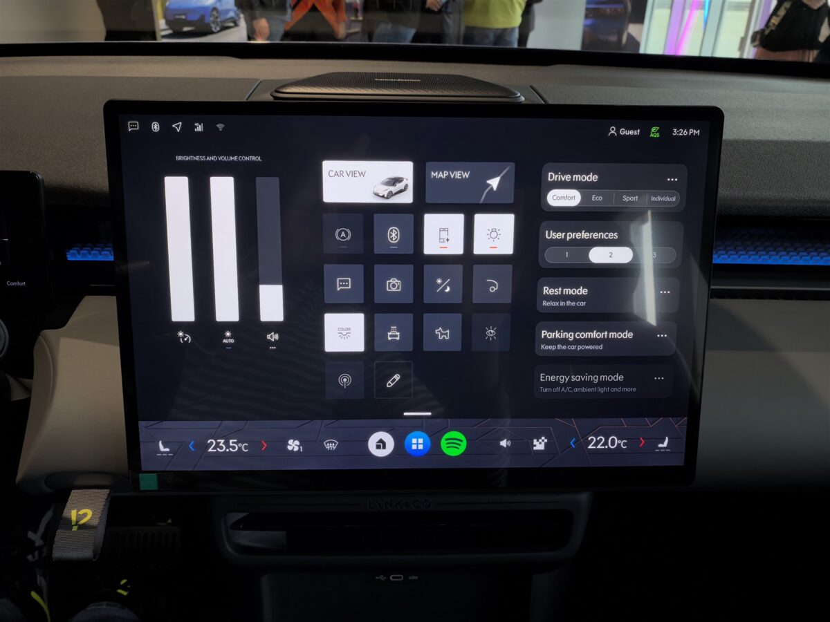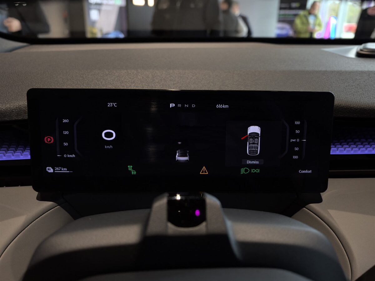 - Display-ul central al sistemului de infotainment are 15.4 inch, rezoluție 2560 x 1600 pixeli și redă culori intense, fiind și foarte luminos. În plus, interfața este foarte bine pusă la punct și totul rulează impecabil (cel puțin așa a fost în cele câteva minute de interacțiune). Ca specificații hardware avem chipset dedicat platformelor automotive Qualcomm Snapdragon 8155, cu procesor octa-core realizat pe 7nm, cu 12GB de memorie RAM și 128 GB spațiu intern de stocare;