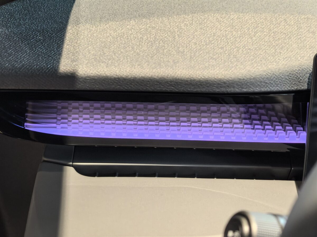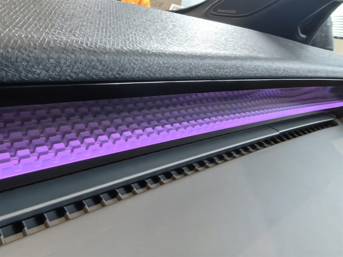 - Banda ce străbate bordul la nivelul volanului, cea iluminată RGB, are o structură 3D care arată în mare fel;