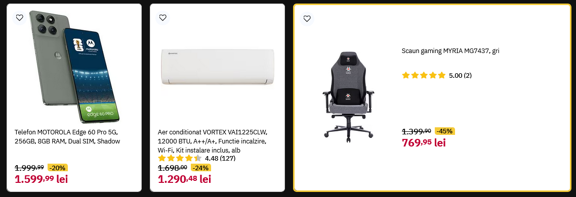 - smartphone Motorola Edge 60 Pro cu 8 GB RAM şi 256 GB stocare – 1599.99 lei (reducere de 20%);