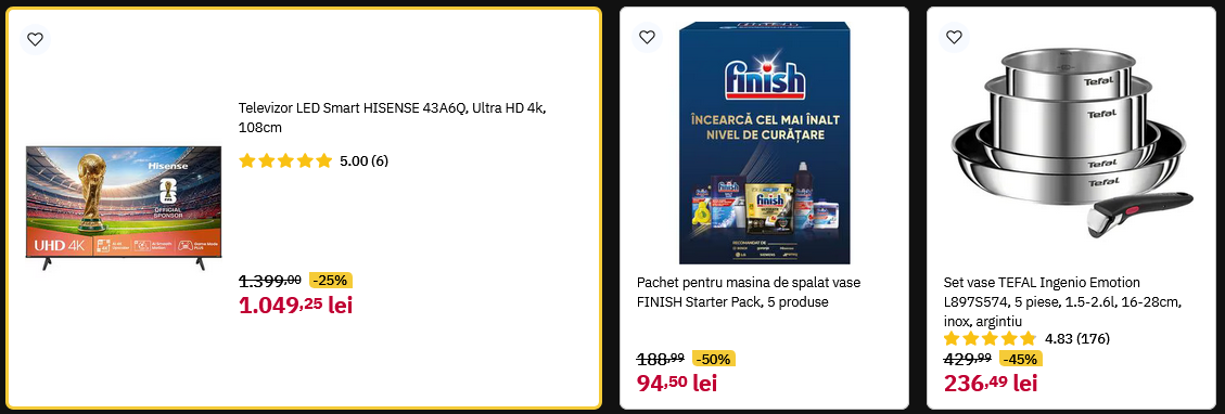 - televizor LED Hisense 43A6Q de 108 cm – 1049.25 lei (reducere de 25%);