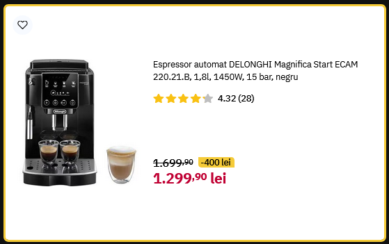 - espressor automat Delonghi Magnifica Start ECAM 220.21.B – 1299.90 lei (reducere de 400 lei).