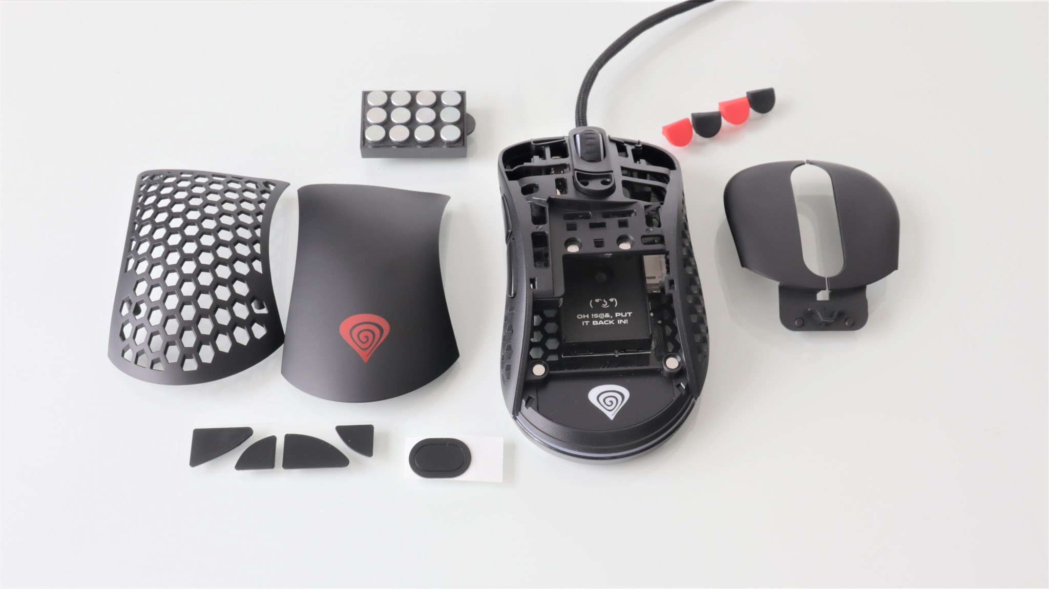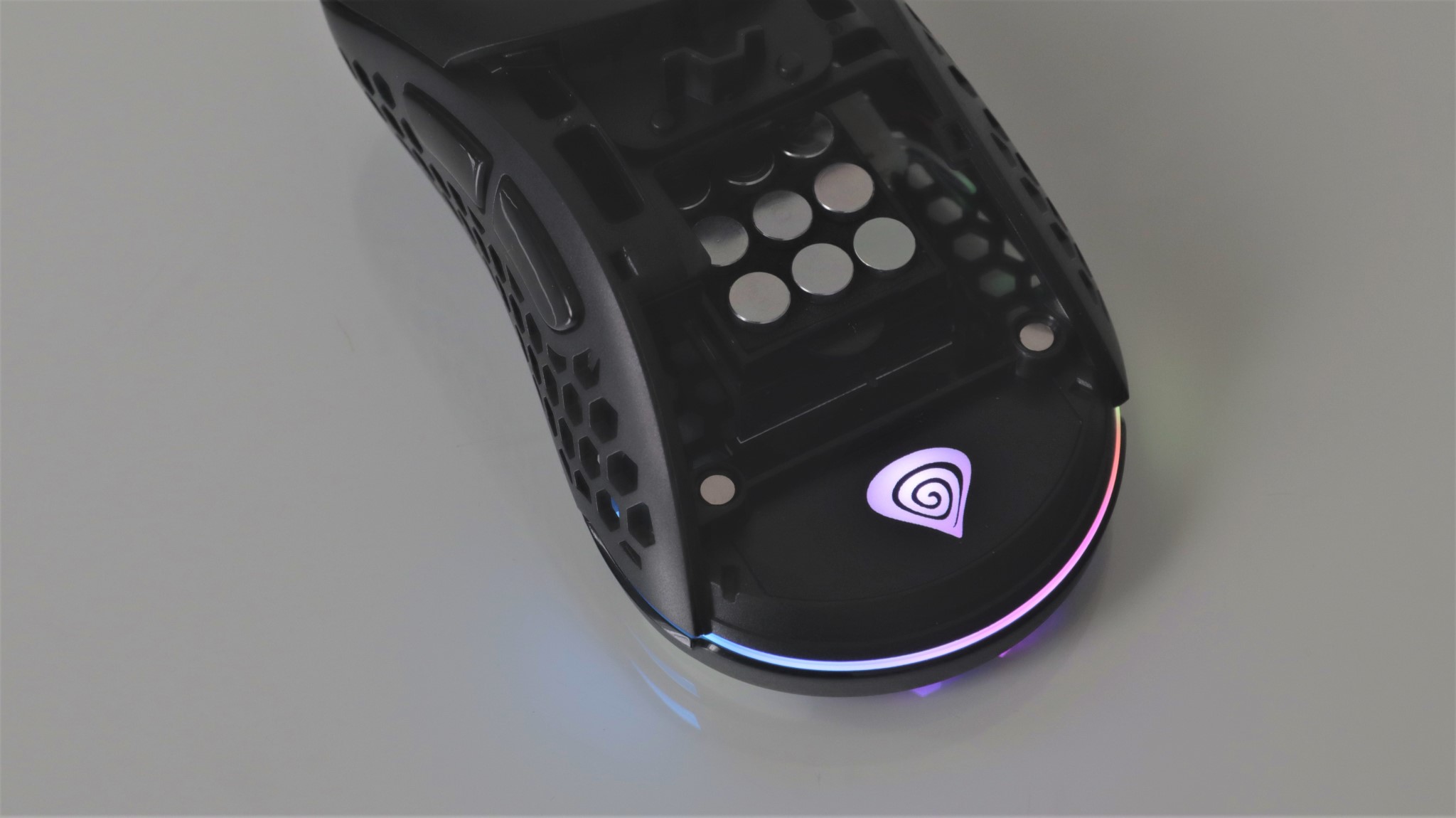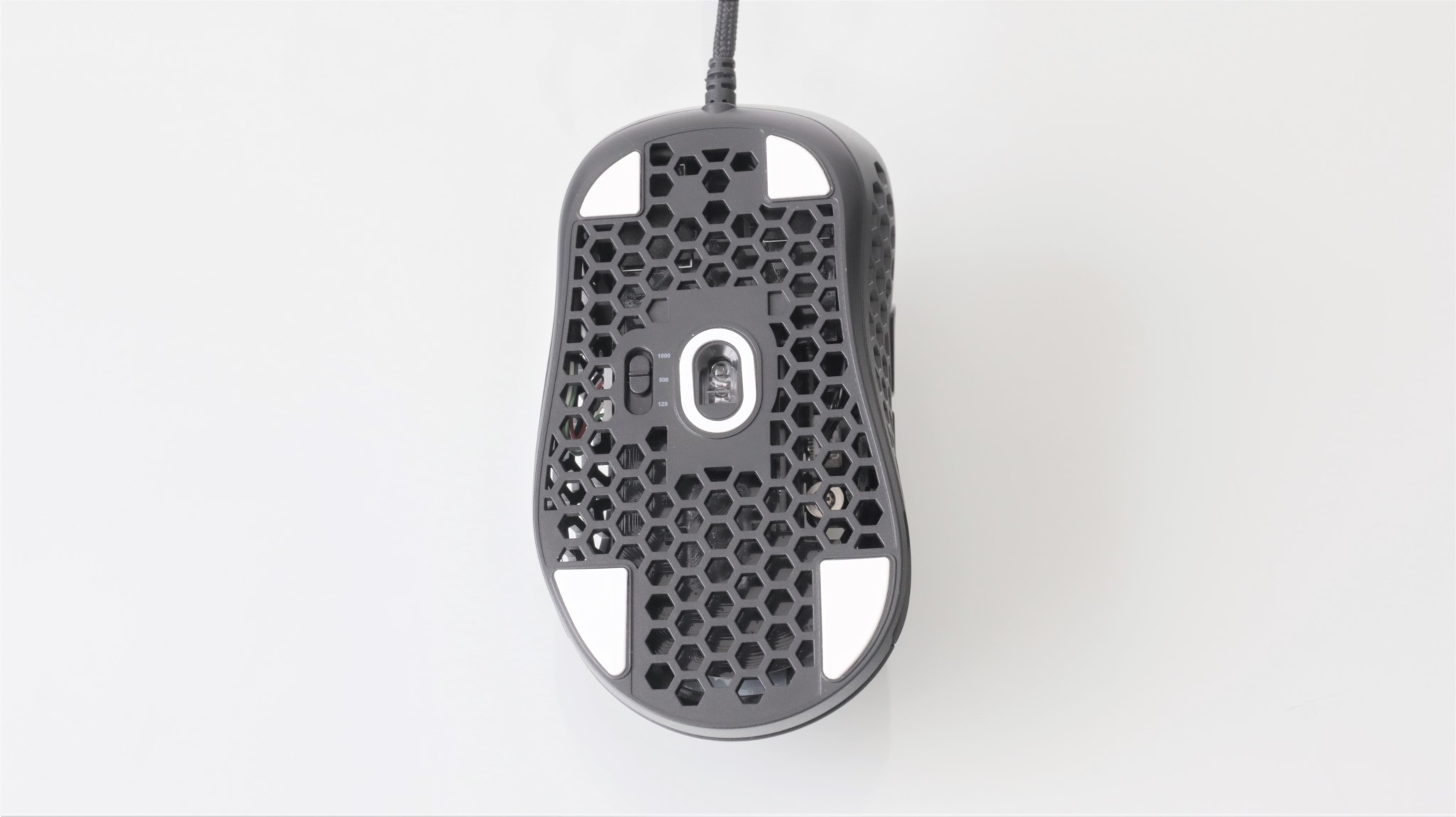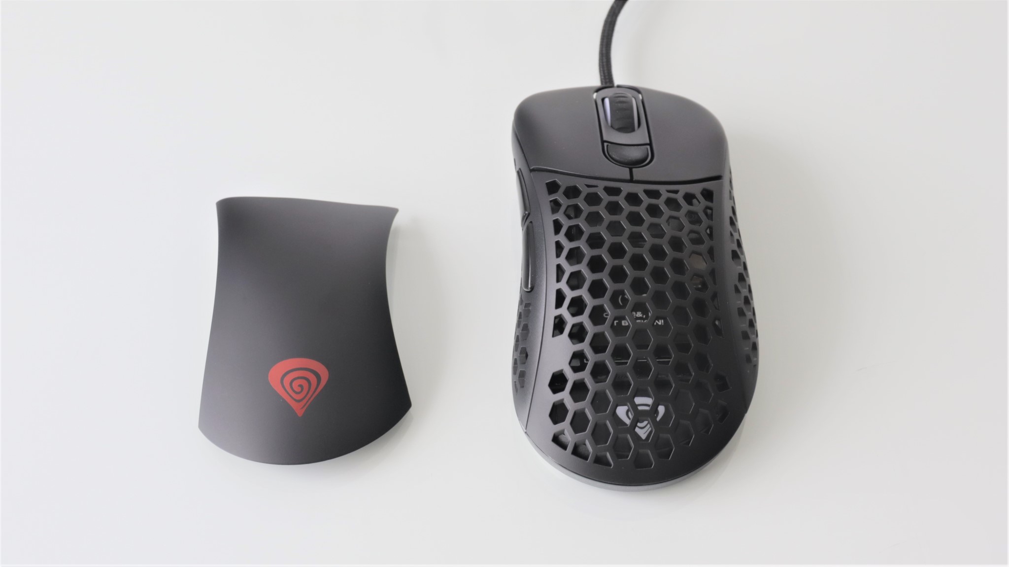 Așa cum este în cutie, mausul este în configurația cea mai ușoară, cu carcasa perforată aproape în totalitate. Ai la dispoziție un capac superior ”întreg” mai greu cu 2 grame față de cel perforat.