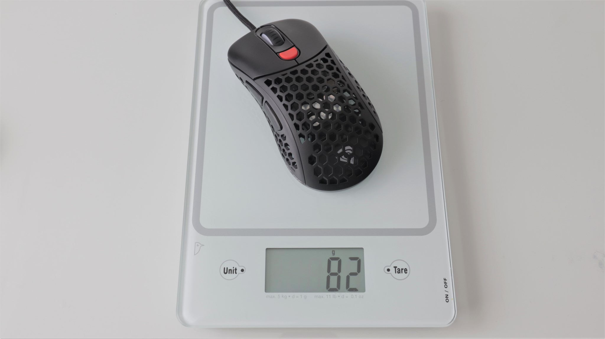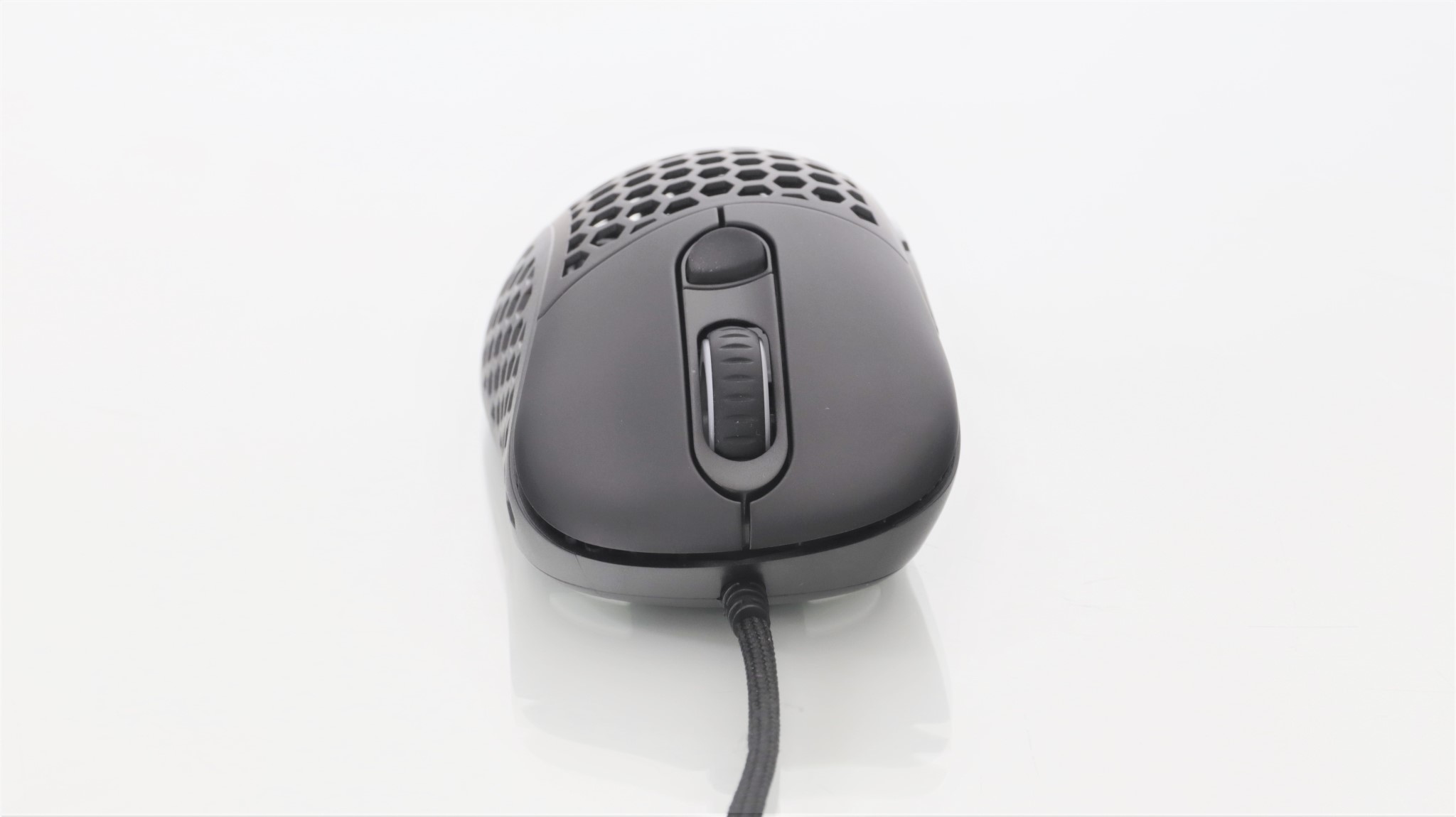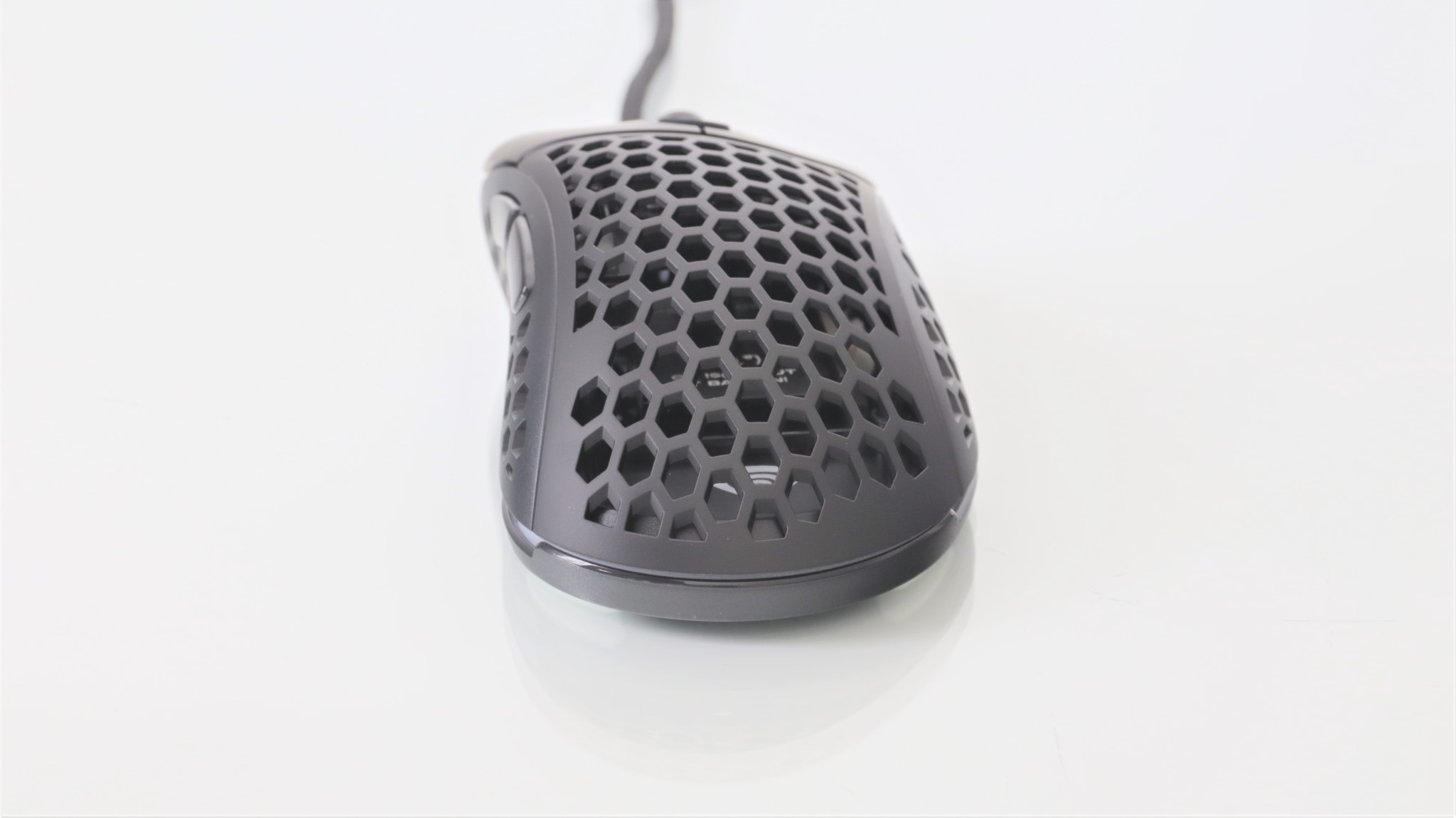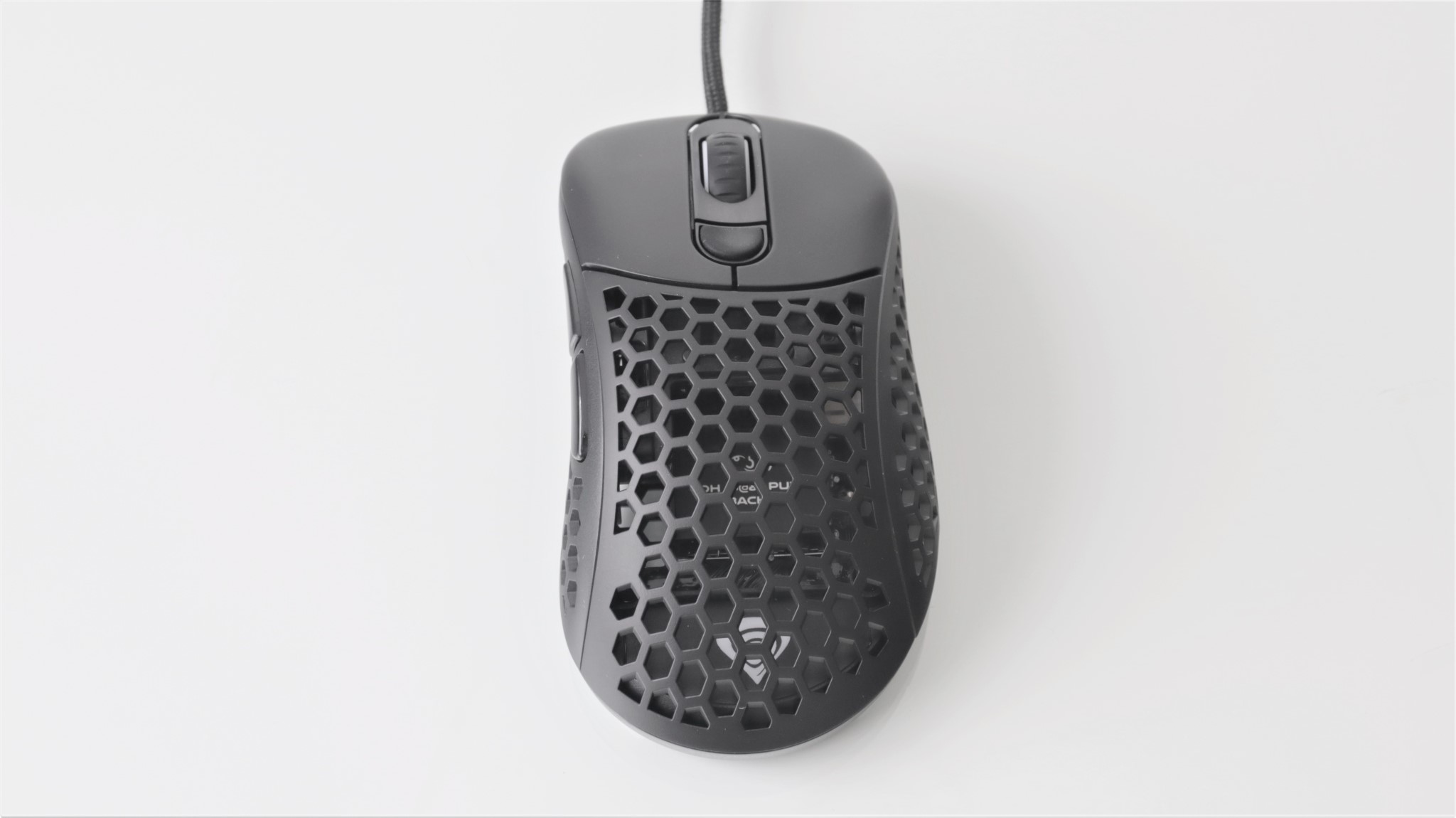 Așa cum este în cutie, mausul este în configurația cea mai ușoară, cu carcasa perforată aproape în totalitate. Ai la dispoziție un capac superior ”întreg” mai greu cu 2 grame față de cel perforat.