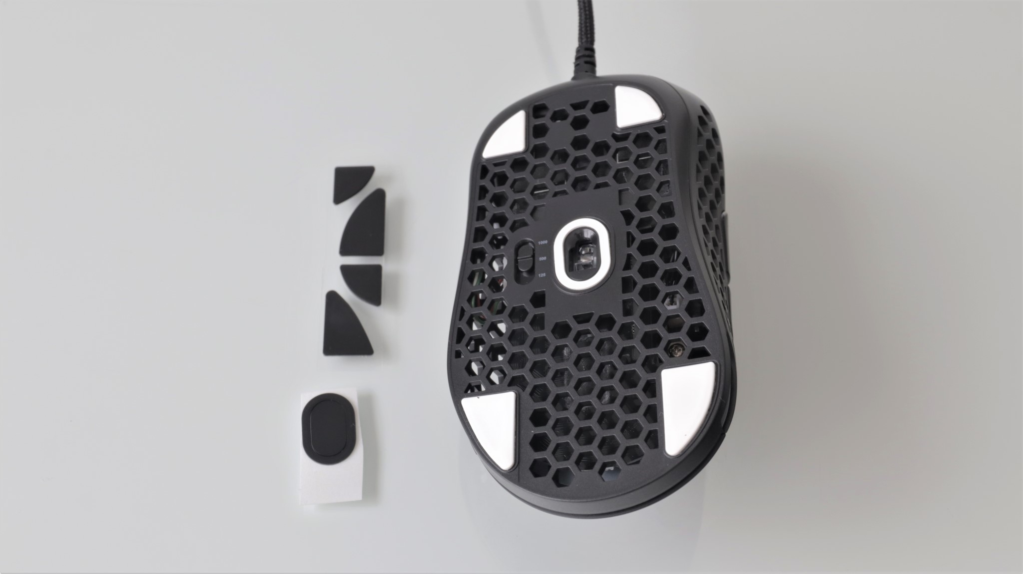 Poți schimba chiar și cele cinci zone de contact ale mausului cu suprafața pe care este folosit. Din fabrică sunt montate unele albe, iar în cutie sunt unele negre. Nu am găsit că ar fi diferite unele față de celelalte decât în ceea ce privește culoarea lor.