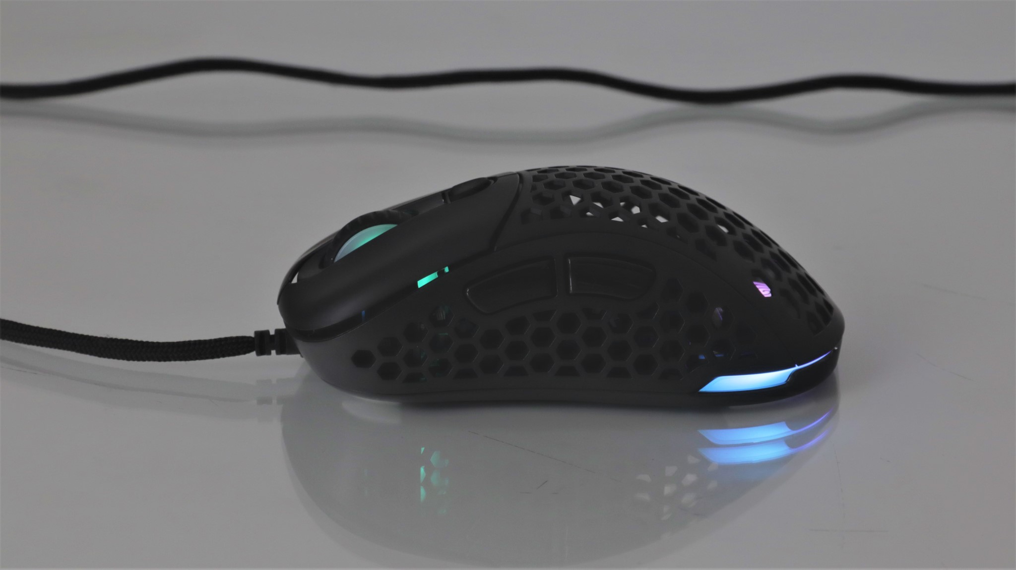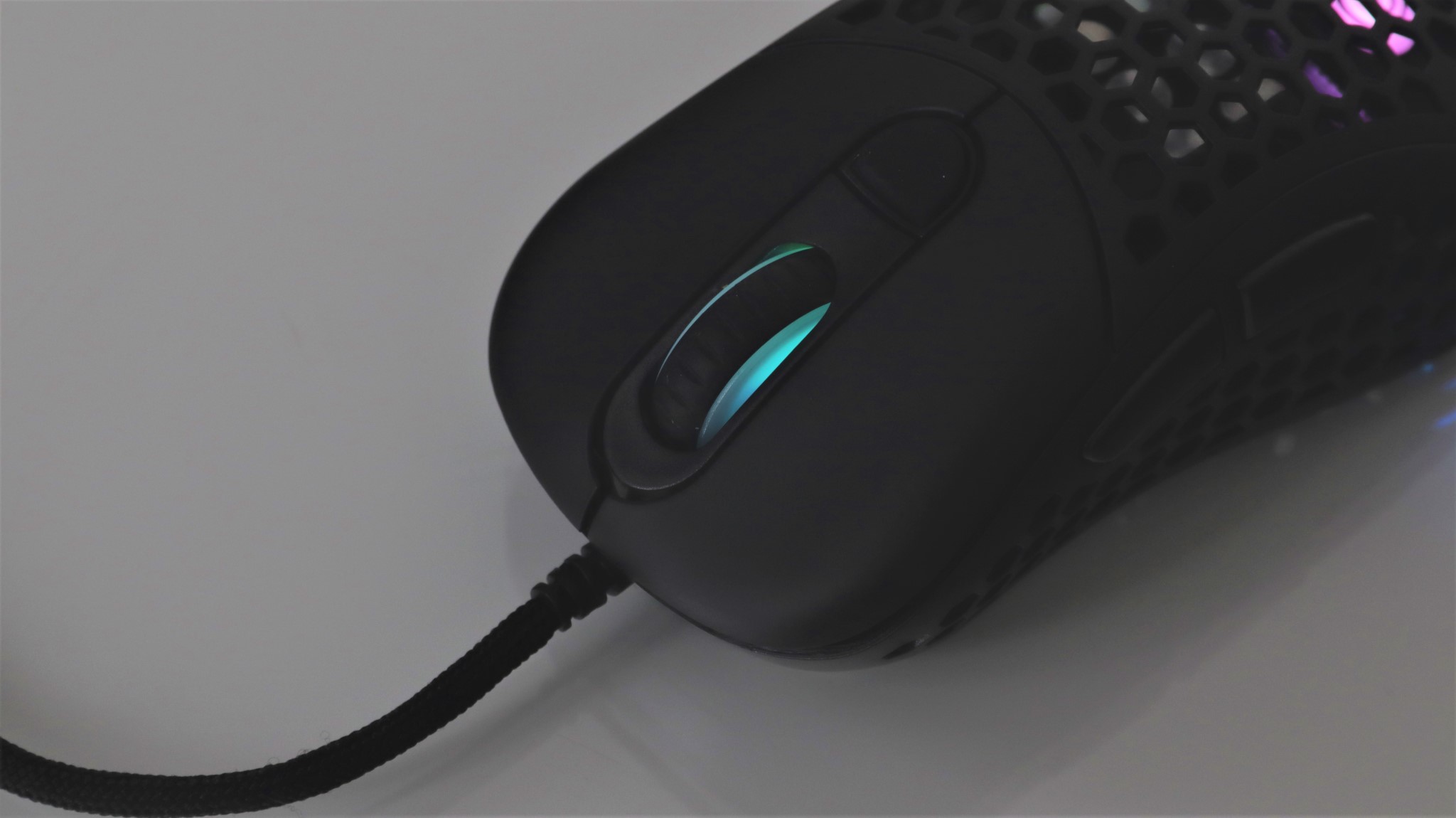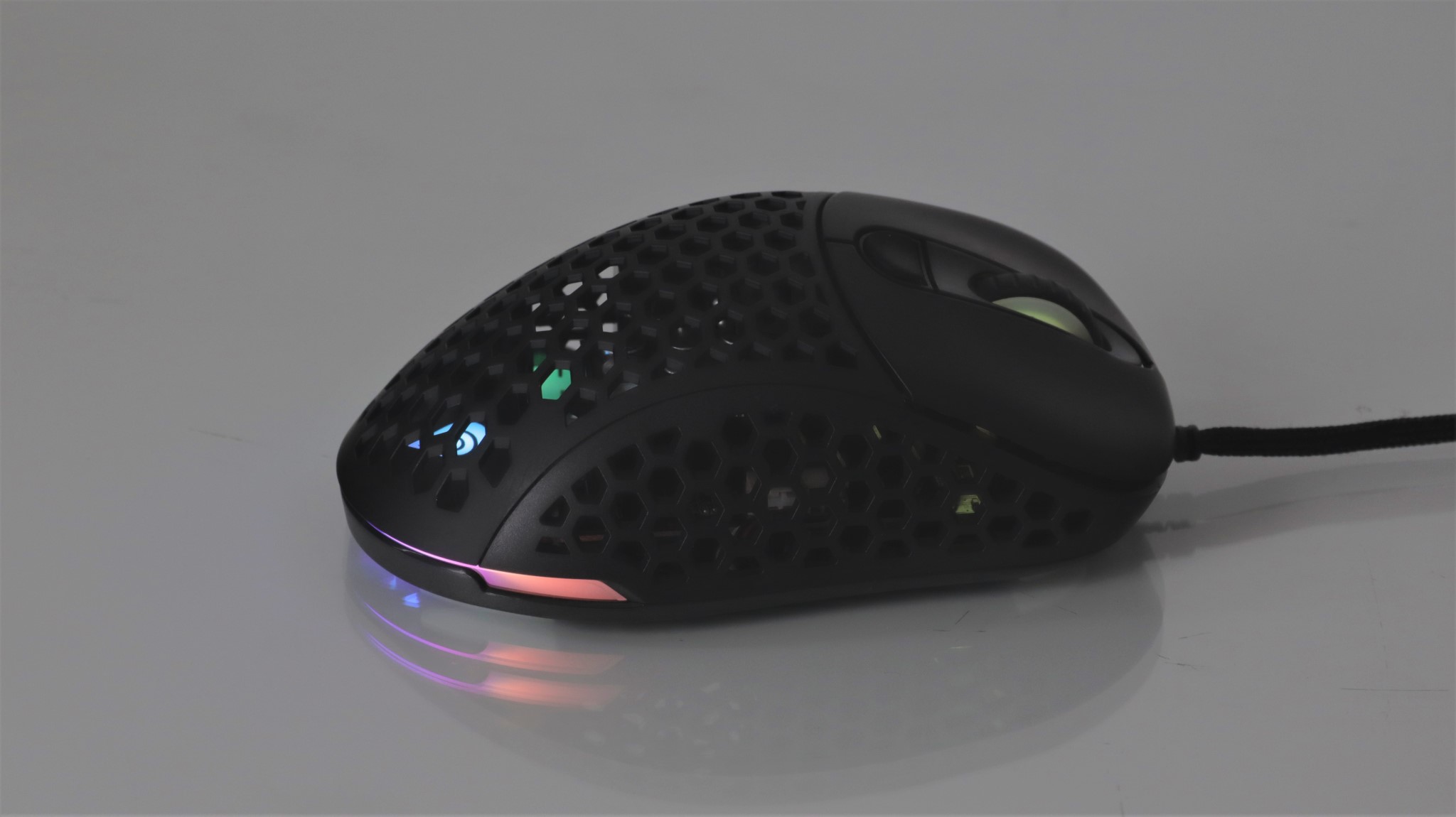 Iluminarea RGB poate fi personalizată cu mai multe efecte, precum și alegerea unei culori stabile. Lumina este vizibilă pe marginile mausului, dar și pe sus, atunci când este folosit capacul perforat. Totodată, rotița de scroll este și ea iluminată.